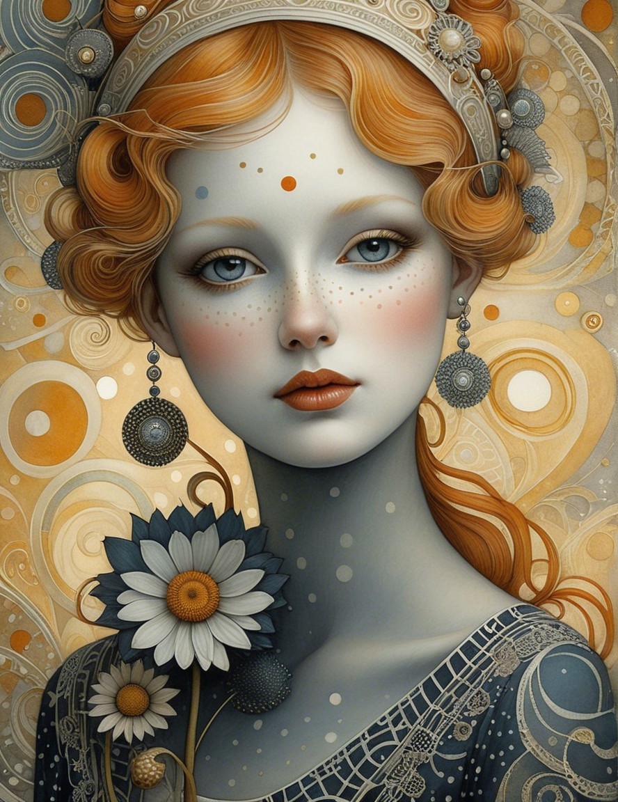 A captivating portrait of a woman with vibrant red hair and a stylish crown. She has delicate features, wearing earrings and holding a bouquet of daisies, set against a swirling golden background.