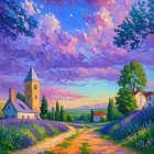 A vibrant landscape features a serene lake reflecting colorful clouds and trees. Quaint houses with a tower sit beside the water, framed by rolling hills and a starry sky at twilight.