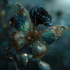 A stunning butterfly with iridescent blue and green wings rests on a vibrant leaf. The delicate details and shimmering hues are beautifully highlighted by soft, glowing light in the background.