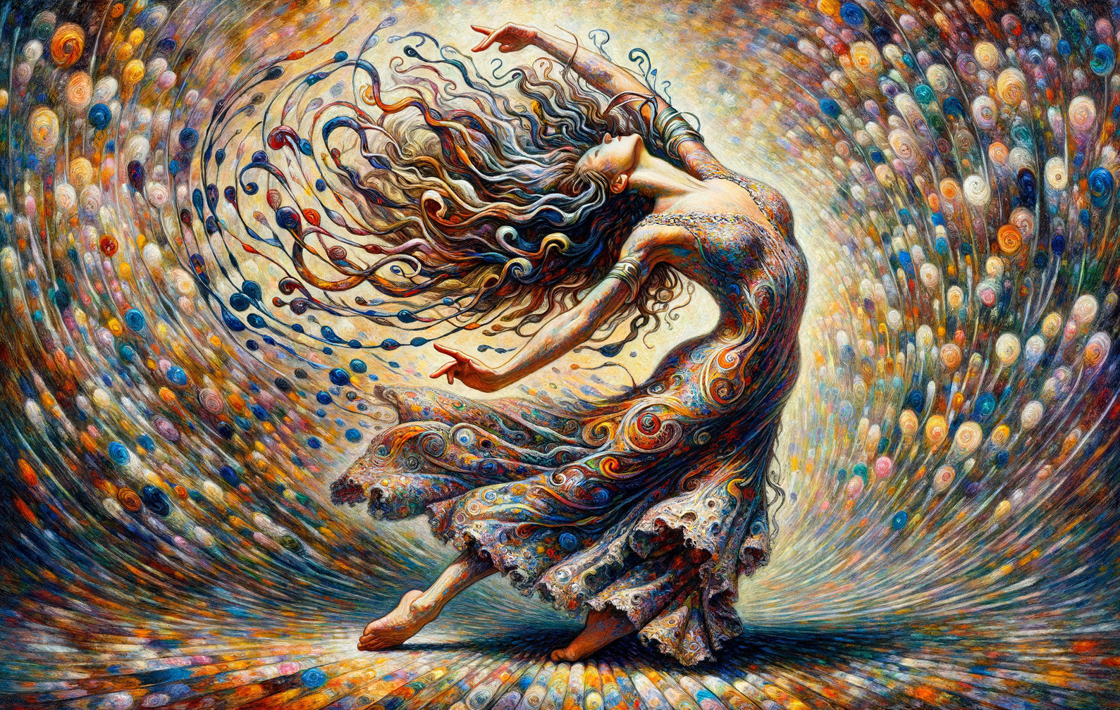 A vibrant, swirling depiction of a dancer, her flowing hair and dress filled with colorful patterns. The background radiates dynamic energy and abstract circles, enhancing her graceful motion.