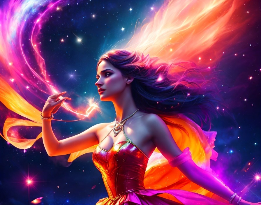 A vibrant artwork of a woman with flowing, colorful hair resembling a galaxy, against a starry space background, wearing a regal, star-themed outfit.