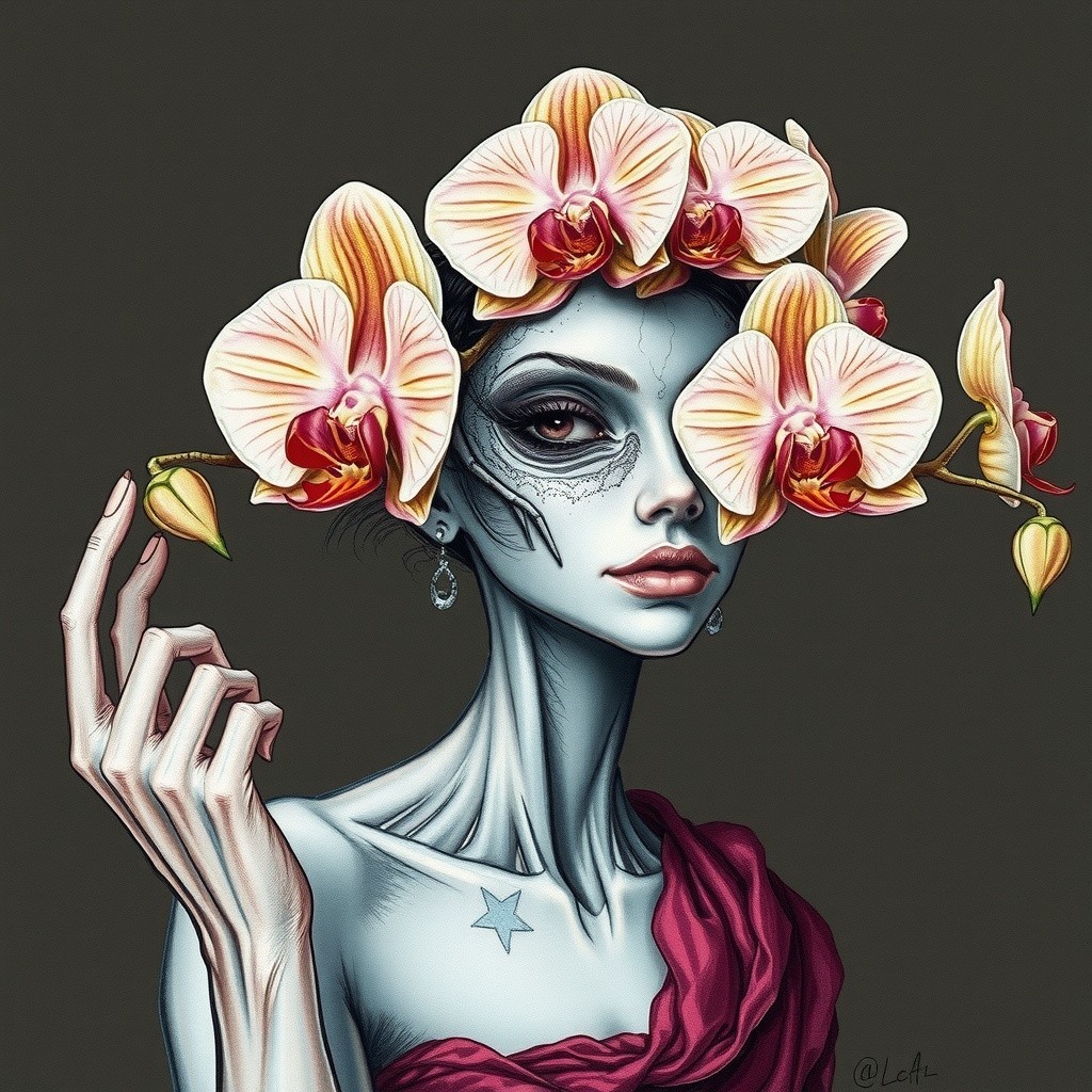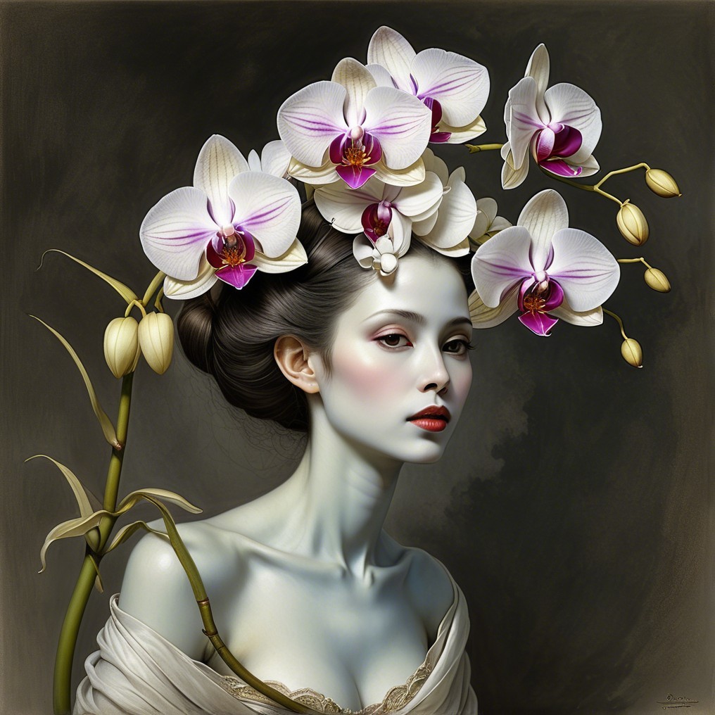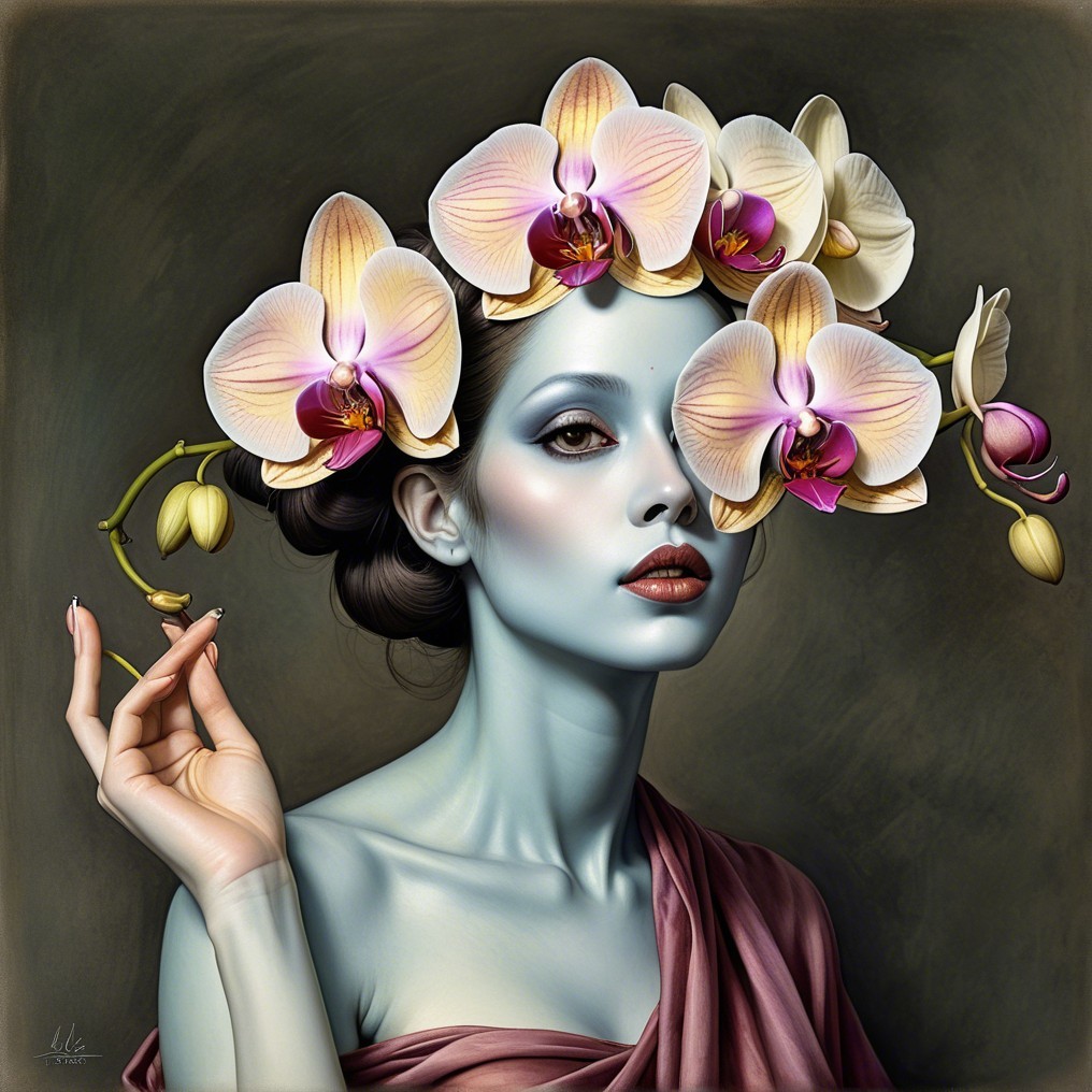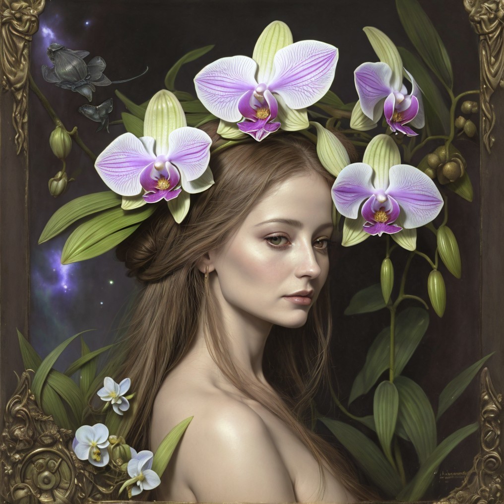 A serene portrait of a woman with flowing hair adorned with vibrant purple orchids, embodying grace and elegance against a soft, muted background. Her expression is captivating and ethereal.
