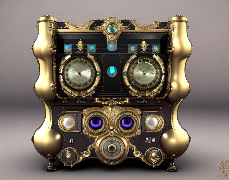 Steampunk device with dials, gauges, orbs, and metallic embellishments