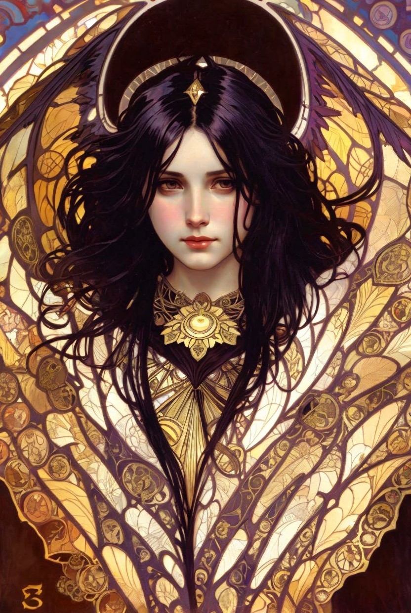 Detailed Art Nouveau Illustration of Female Figure with Feathery Wings