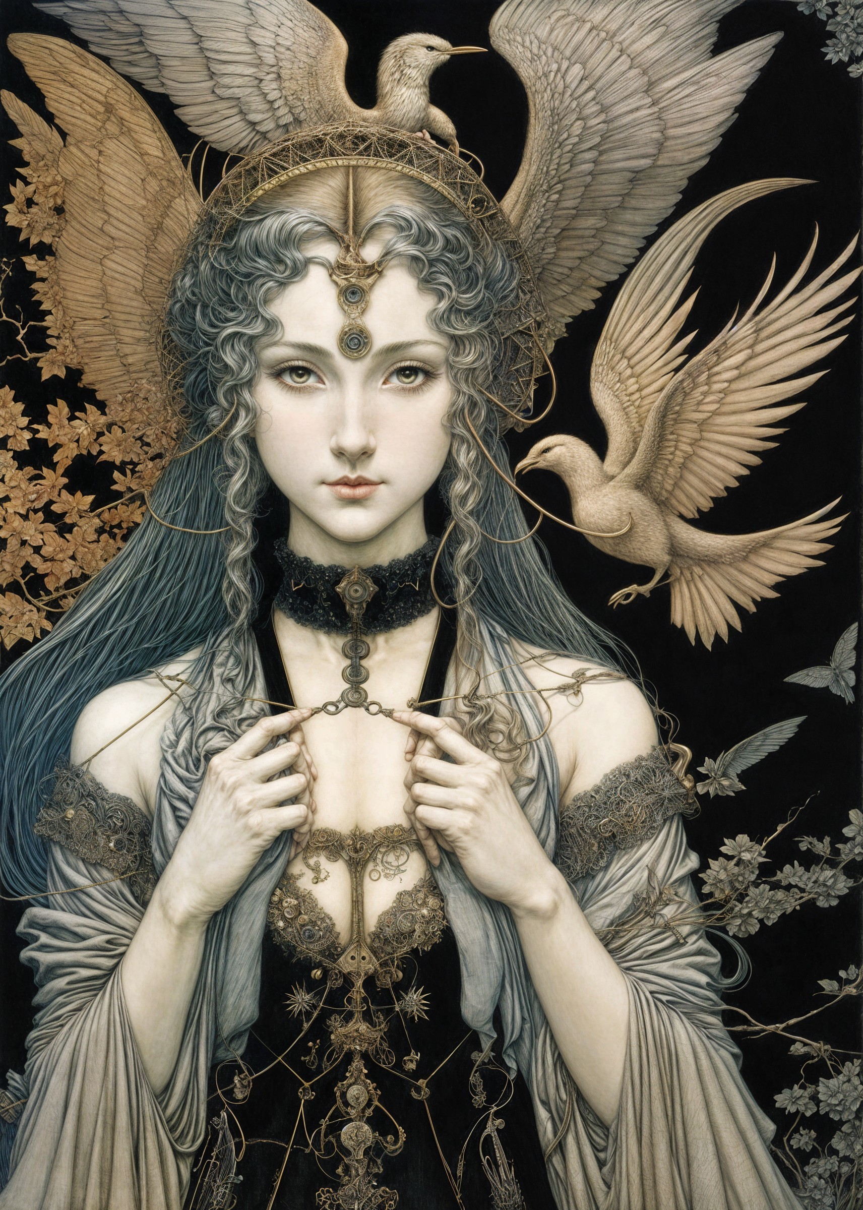 A mesmerizing artistic portrayal of a woman with flowing silver hair, adorned with intricate golden accessories, surrounded by ethereal birds, blending elegance and nature in a striking composition.