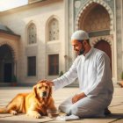 A man in traditional attire sits on a patterned rug, gently offering a treat to a large, attentive dog. They share a calm moment in a warm, elegantly designed indoor space.