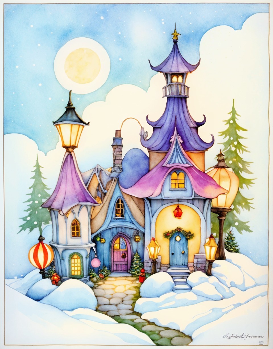 A whimsical winter scene featuring a colorful, fairy-tale cottage with tall, whimsical towers and glowing lanterns, surrounded by snow-covered trees and a bright moon in a serene sky.