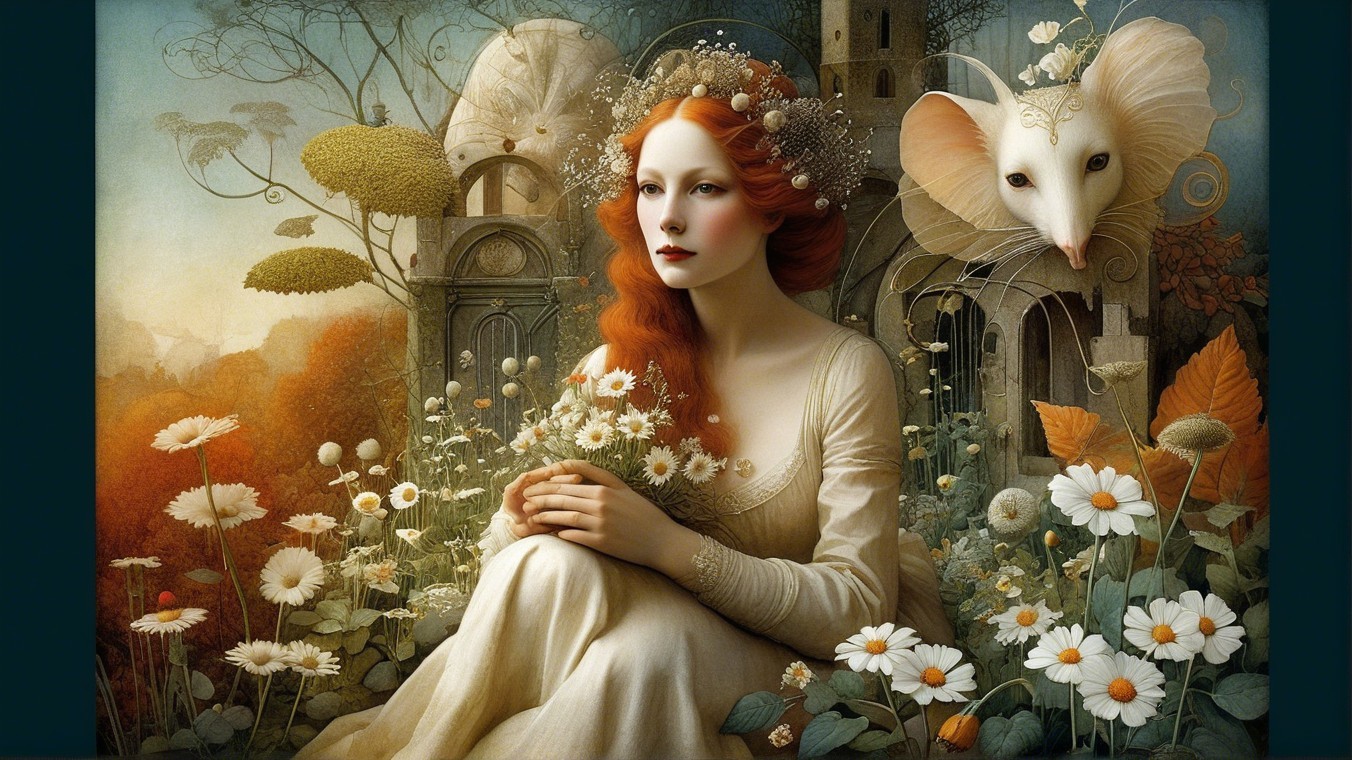 A serene young woman with flowing red hair sits among daisies in a whimsical garden. She wears a flowing white gown, while a fantastical creature with an elephant-like face watches nearby.