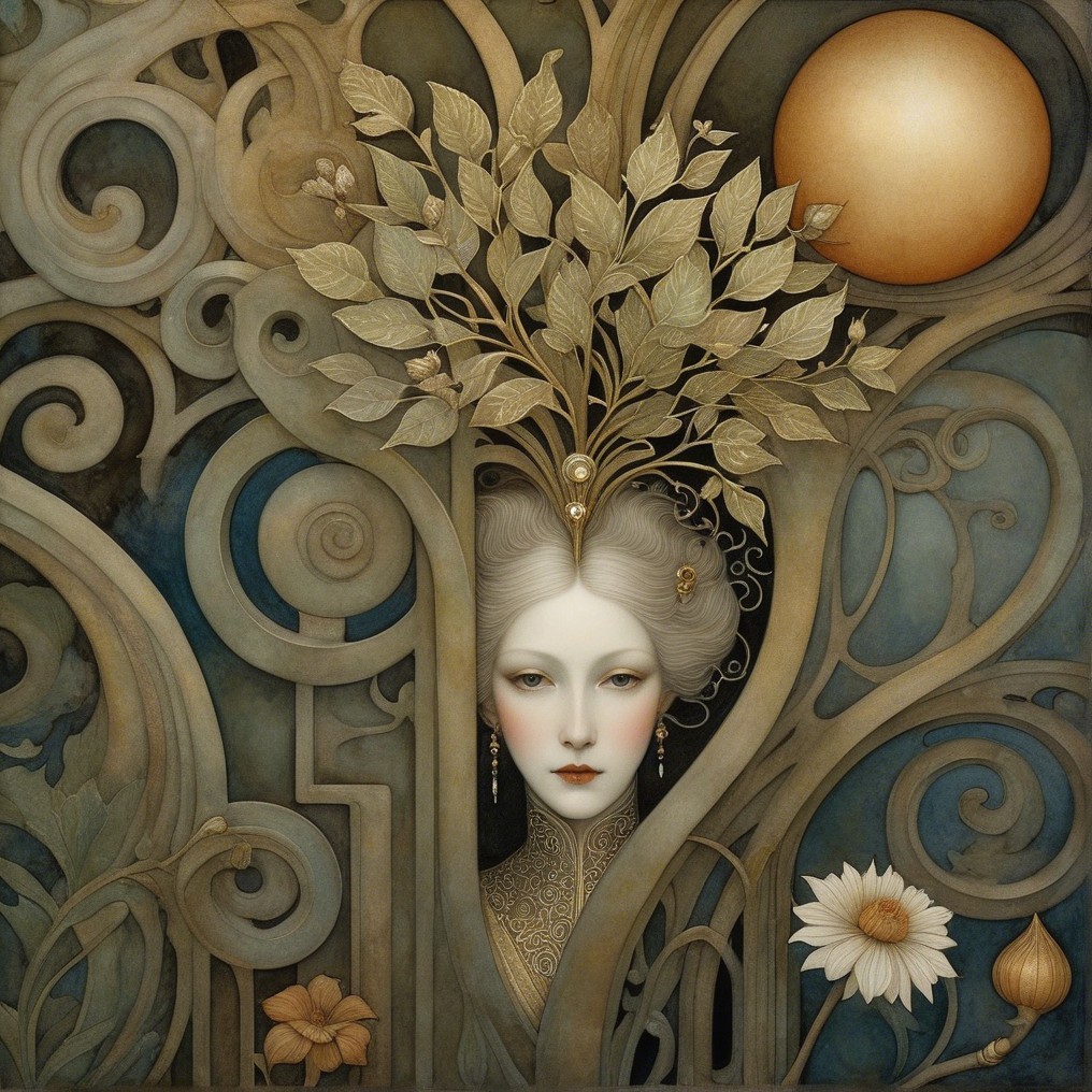 A serene figure with ethereal features emerges from intricate floral patterns and ornate designs, surrounded by elegant, golden lanterns, creating a mystical and harmonious atmosphere.