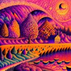 A vibrant, surreal landscape features stylized purple and orange trees, rolling hills, and a yellow house. A crescent sun casts an otherworldly glow over the tranquil scene.