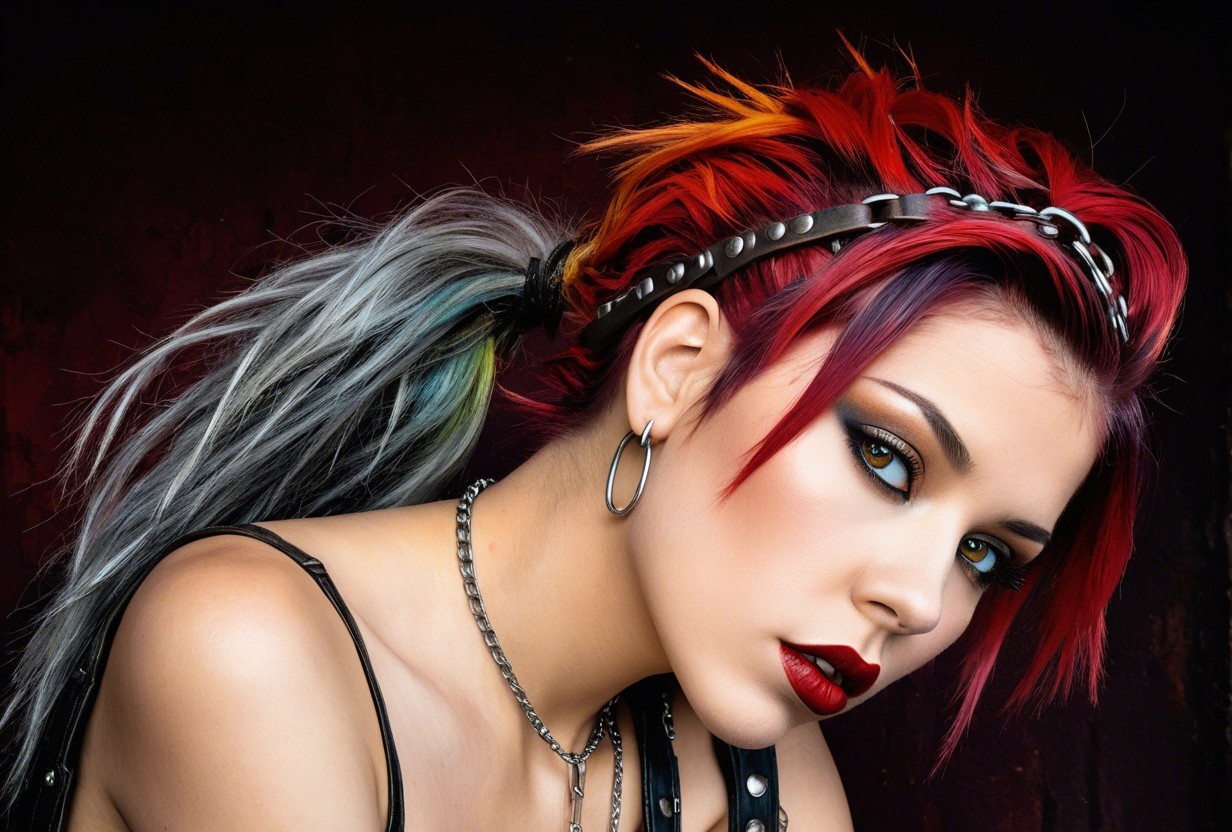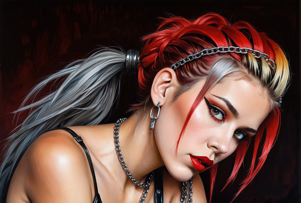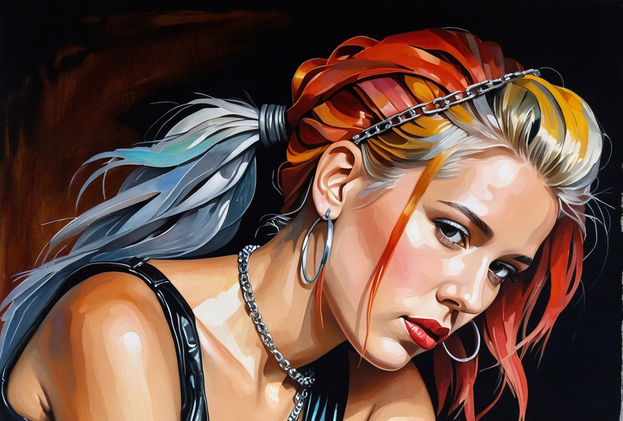 Fauvistic acrylic painting, in the style of hobo and chibli, anatomically correct features, Novelty architecture, weathered, dyed, 64K, beautiful punk girl with dyed iridescent hairstyle wearing a leather dress, chains and filament lines in metallic warm colors as silver, bronze, red, eroticism, grungy, multi-layered eyes, visible textures, divisionism, sculpted, cel-shaded, friendly, serene facial expression, emerging from distance. Neon art details, fluorescent, artistic, reminiscent of sgraffitto and street graffiti. , UHD, HDR, HQ hyper realistic facial features, 4k 4K 3D, detail high definition, pencil sketch of a stippled portrait, tesselated background, azure sky, beige light, pointillism techniques, in shades of grey, light green, red, burnt orange, black, sienna and burnt umber, reminiscent of Yayoi Kusama, Henri Toulouse-Lautrec, and William Turner. Reminiscent of woodcut-inspired graphics for plasticity, mesmerizing contrasts. Nikon D850, attractive, beautiful warm colors, hyper realistic, cinematic, panavision, harsh lighting cinematic postprocessing, anatomically correct features, 64K, xeroxed with Ilford Sprite 35-ii Reusable camera, push processing, overspray of paint, blotting technique,