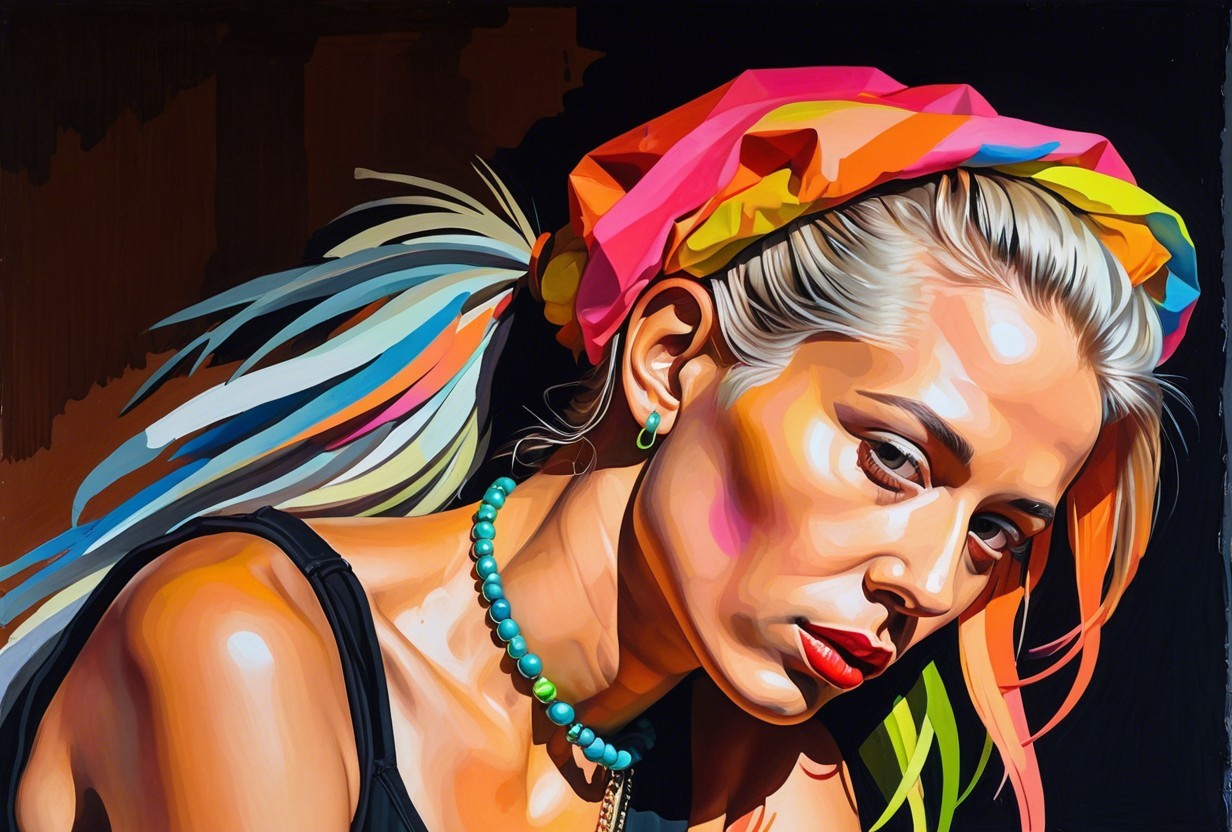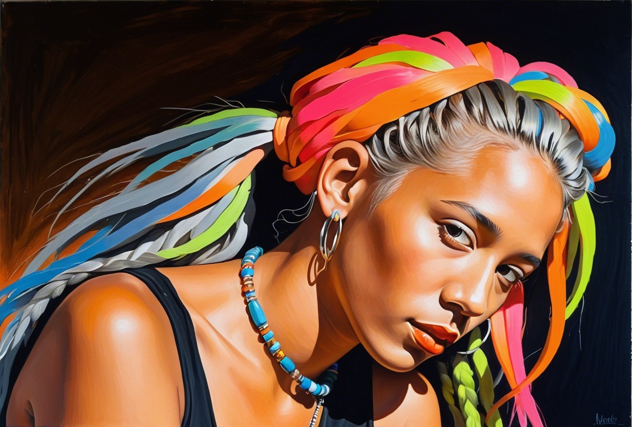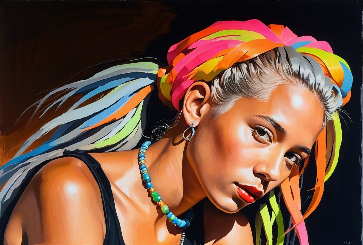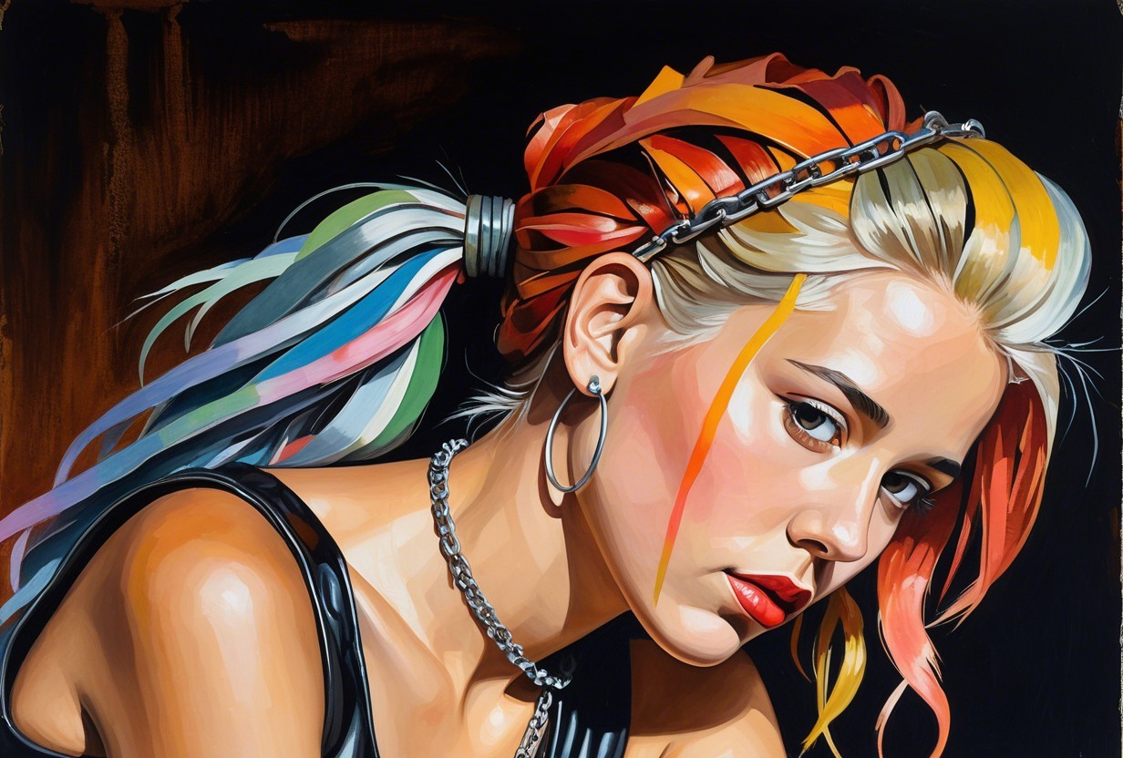 Fauvistic portrait, stylized gouache painting, reminiscent of hobo and chibli, dyed dreadlocks, metallic jewelry, Neon art details, fluorescent, artistic, juvenile, Outlier drawing, encaustic, orton effect, overexposed, overspray of paint. Cel-shaded, Mixed media using tissue paper, white wash over painting. Hues of Matisse for airy look.,weathered, dyed, luminism, dyed iridescent hairstyle, leather dress, chains, filament lines in metallic warm colors as silver, bronze, red, eroticism, grungy, multi-layered eyes, visible textures, divisionism, sculpted, cel-shaded, friendly, serene facial expression. reminiscent of sgraffitto and street graffiti. UHD, HDR, HQ hyper realistic facial features, 4k 4K 3D, detailed high definition, pencil sketch, stippled, tesselated background, dark sky, beige light, pointillism details, tones of grey, light yellow, red, burnt orange, sienna and burnt umber, reminiscent of Yayoi Kusama, Henri Toulouse-Lautrec, and William Turner. Reminiscent of woodcut-inspired graphics for plasticity, mesmerizing contrasts. Nikon D850, attractive, beautiful warm colors, hyper realistic, cinematic, panavision, harsh lighting, cinematic postprocessing, anatomically correct features, 64K, xeroxed with Ilford Sprite 35-ii Reusable camera, push processing, overspray of paint, blotting technique, delicate coloring 1.9, rounded edges, quilling, quaint, joyful, anatomically correct features 64K,HDR, ,baroque, foampunk 1.7, octane render illustration 1.5, subtle coloring, romantic abstraction, Diffused lighting, brightness 1.9, stylized artwork by William Bradley and Barclay shaw