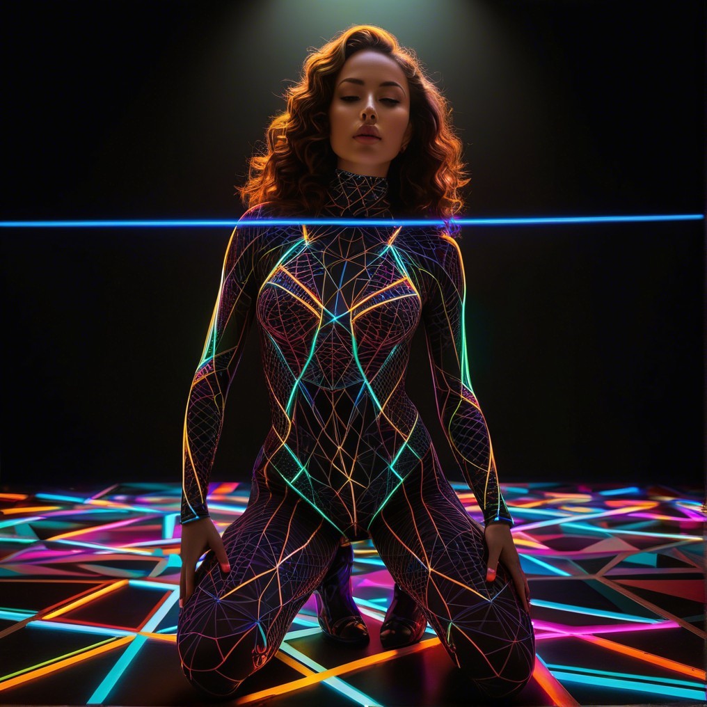 A striking Female in a glowing, geometric bodysuit poses on a vibrant, illuminated floor. The outfit features colorful neon lines, creating a captivating and futuristic aesthetic.