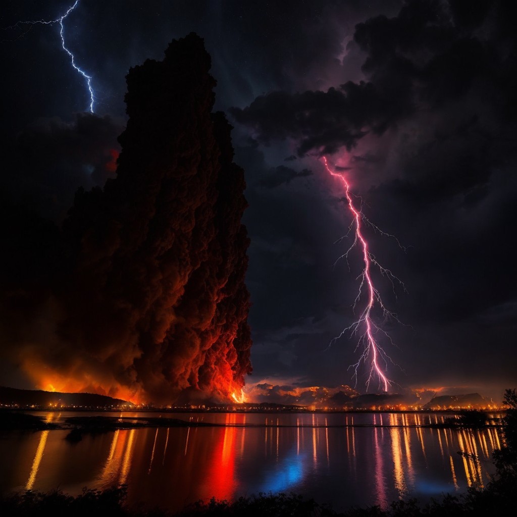A dramatic scene with lightning striking near a fiery landscape, reflecting in water beneath a dark, stormy sky.