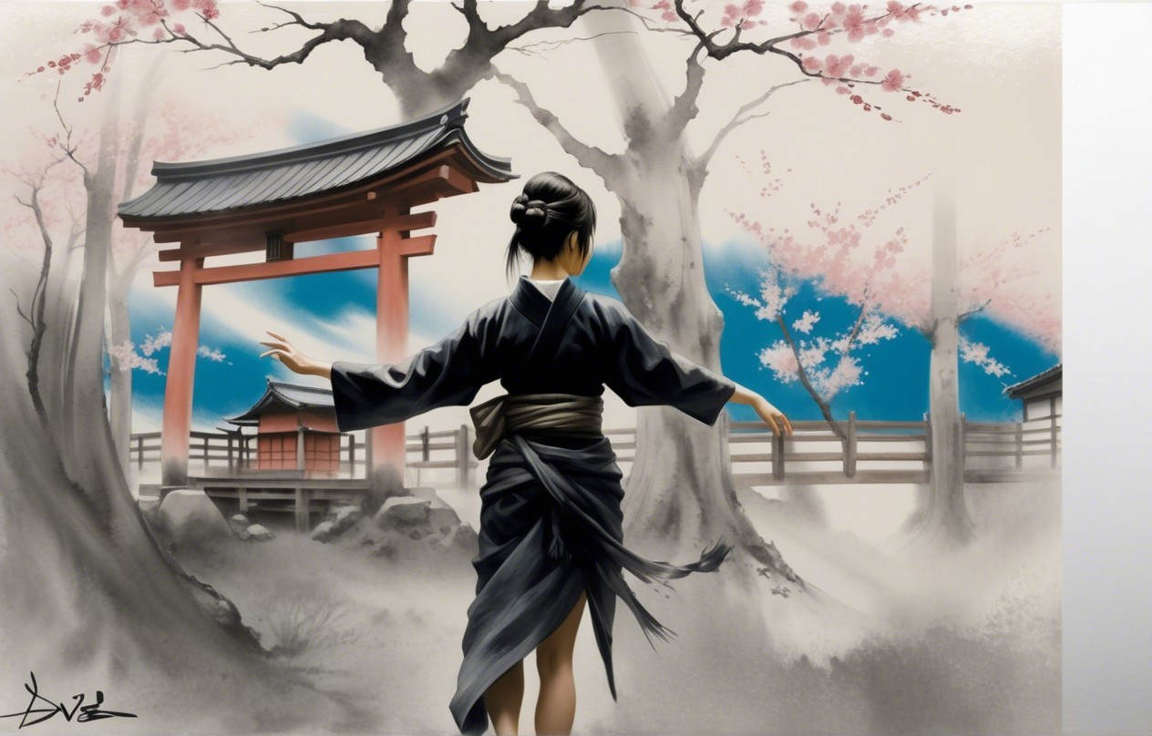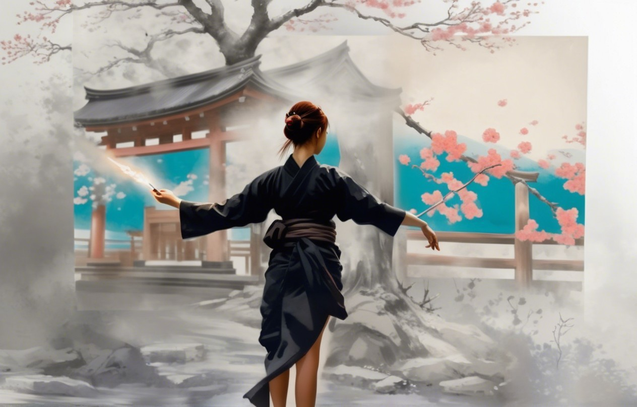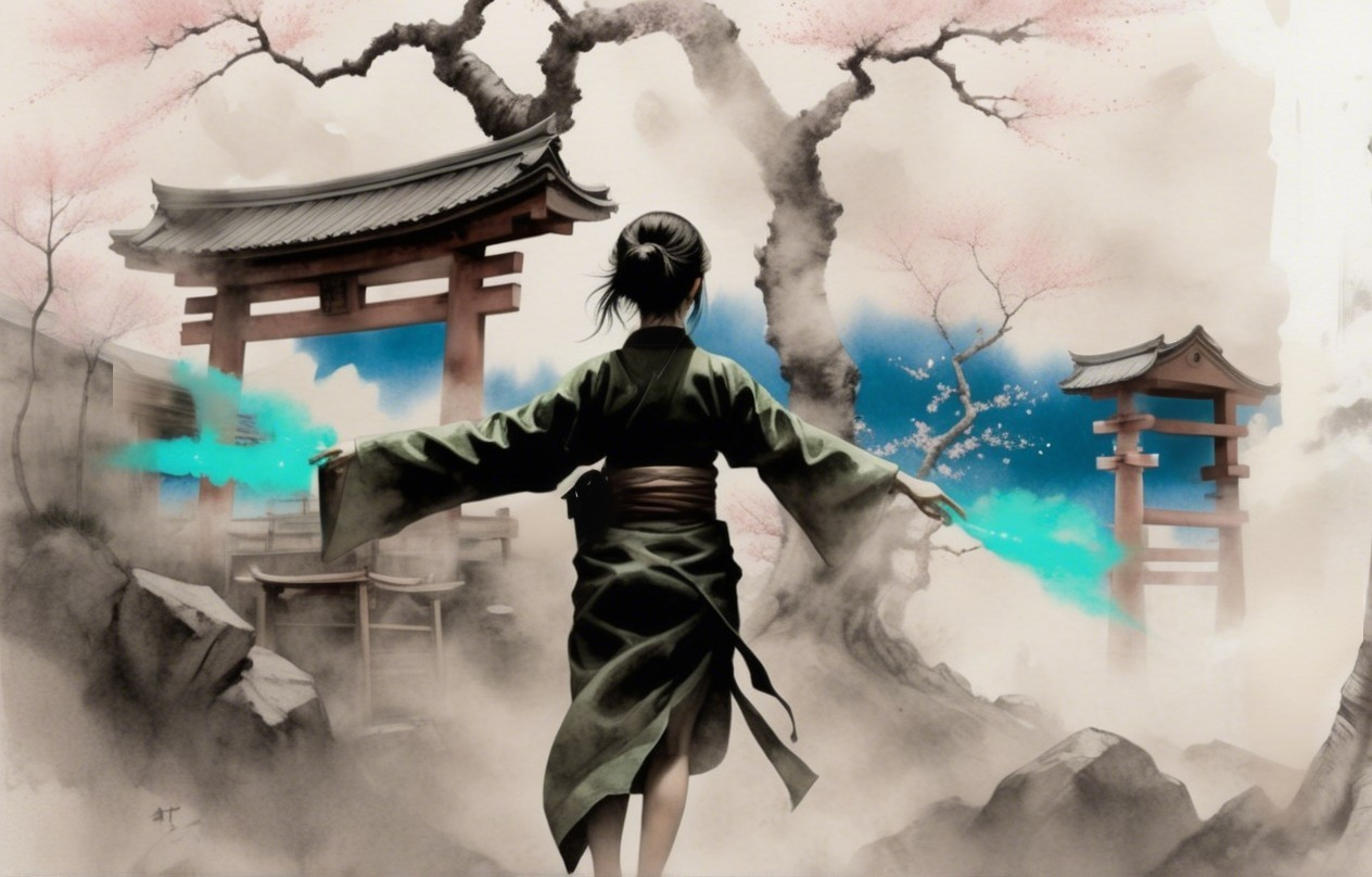 Japanese sorceress casting a spell, green fire from her hands, facing away from viewer, shinto village with Sakura trees, ink wash painting, dark, abstract, ominous, style of Dave McKean and Stephen Gammell