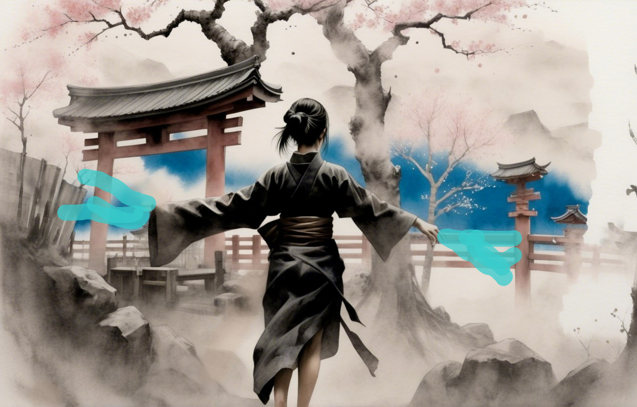 Prompt: Japanese sorceress casting a spell, green fire from her hands, facing away from viewer, shinto village with Sakura trees, ink wash painting, dark, abstract, ominous, style of Dave McKean and Stephen Gammell