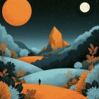 A serene landscape features a lone figure walking through rolling hills. A large orange moon hangs in a starlit sky, illuminating a distant rocky peak and lush, stylized foliage in vibrant colors.
