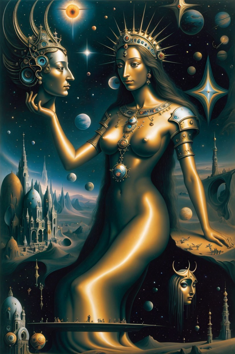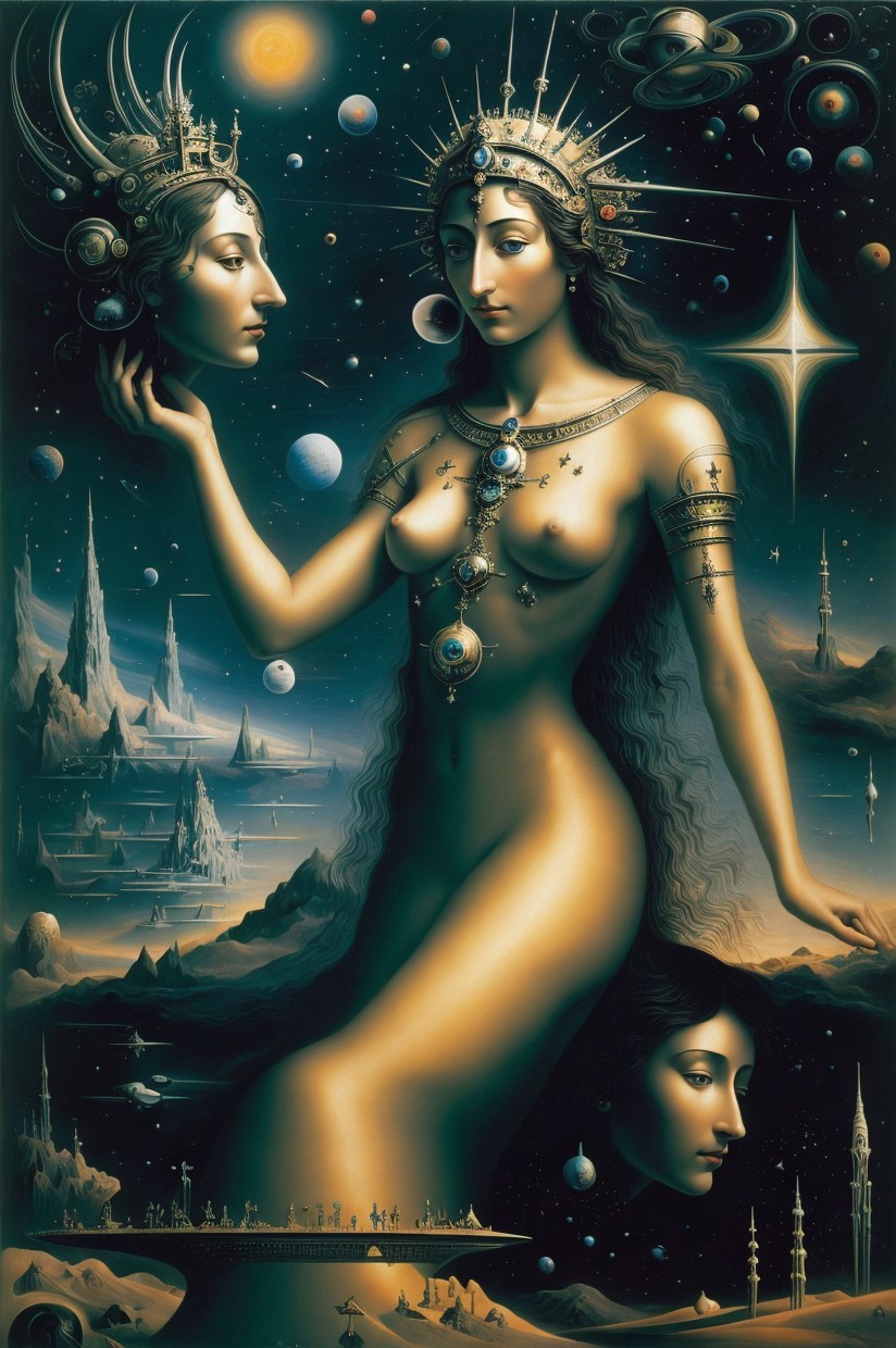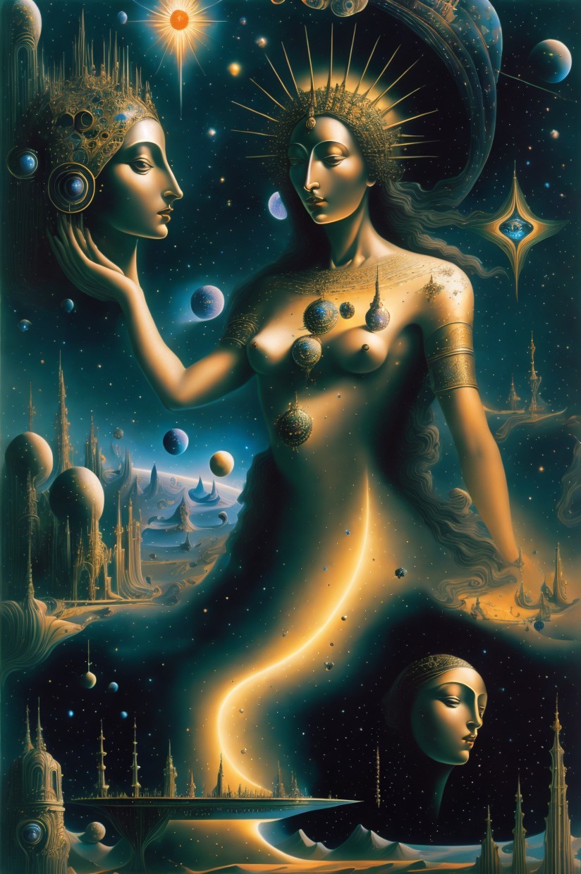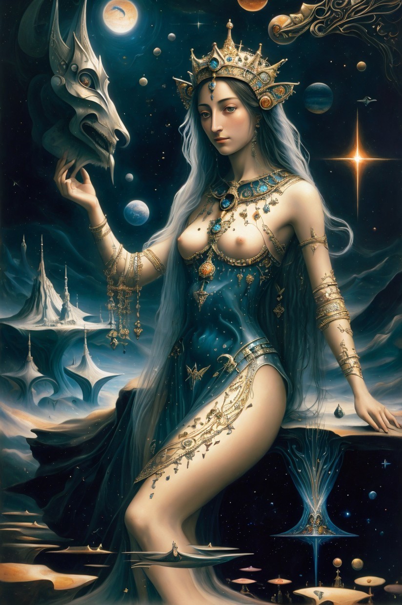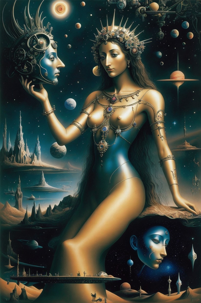 Surreal artwork of woman with elaborate headdress in cosmic landscape