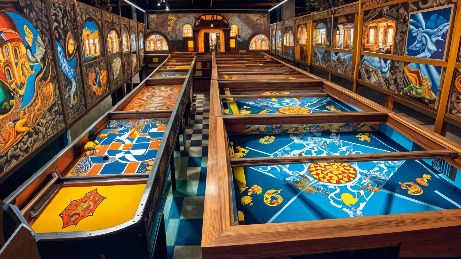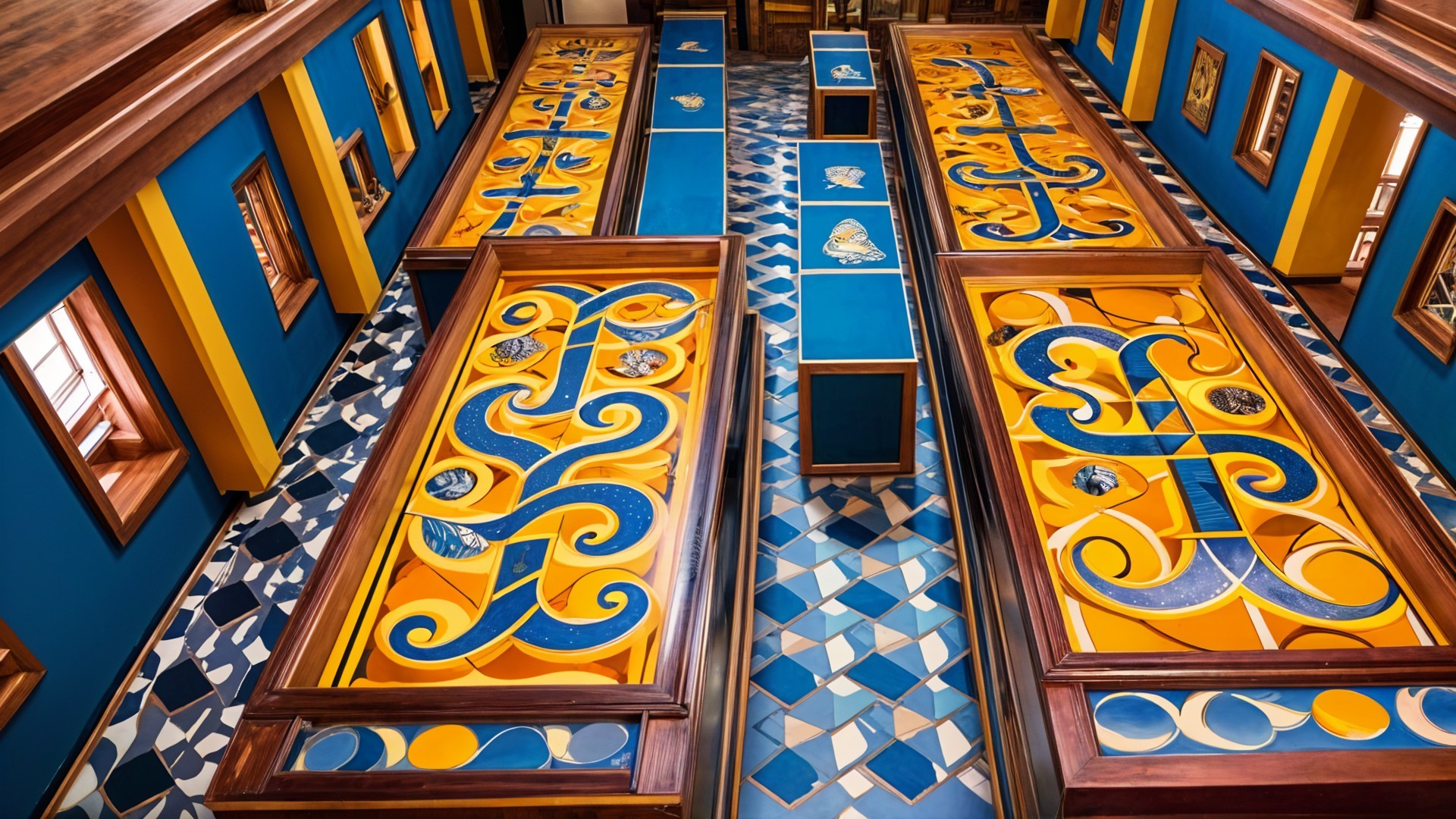 The image features a vibrant room with multiple intricately designed tables, each showcasing unique patterns in blue and white, complemented by bright yellow curtains and a geometric blue floor.