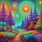 A vibrant landscape filled with swirling colors, featuring stylized trees in shades of purple, orange, and blue. A winding path leads through lush hills under a bright, swirling sky.