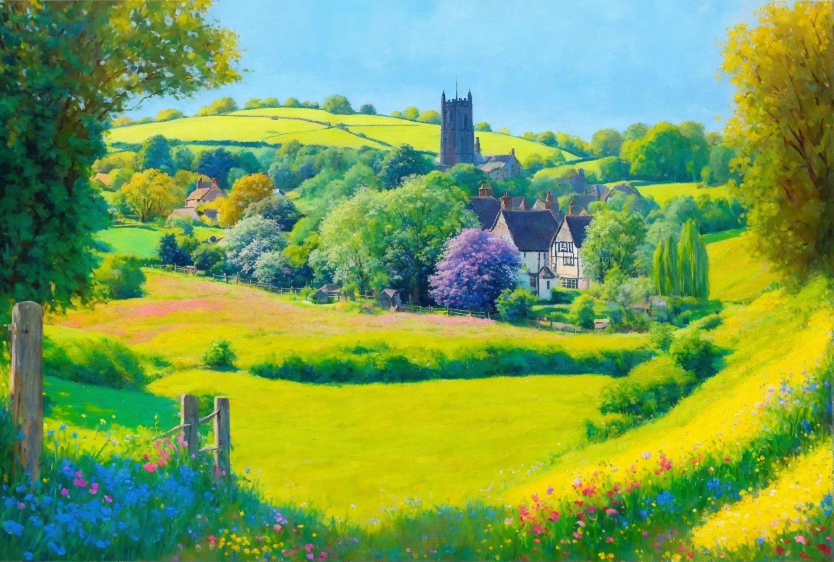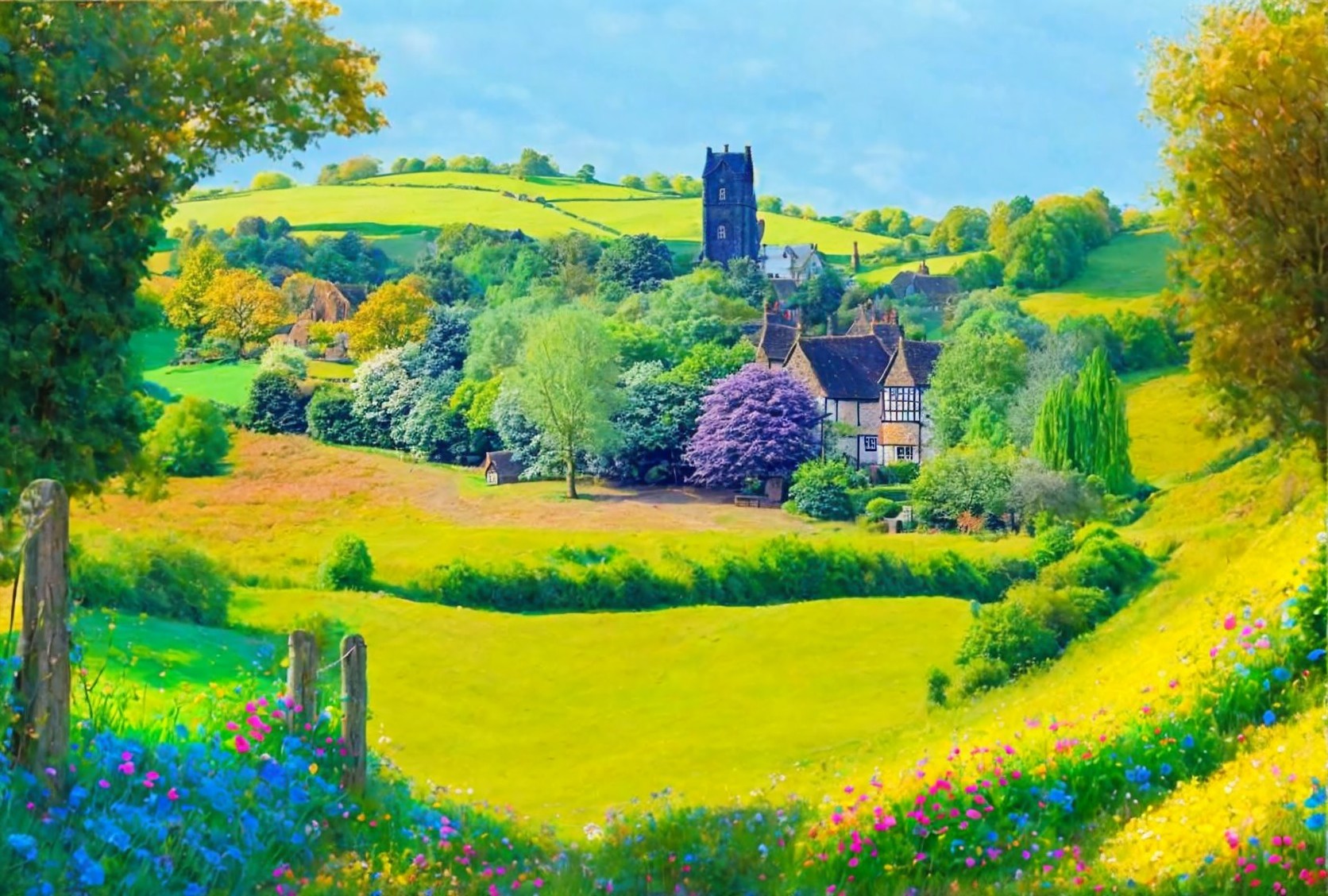 A vibrant, pastoral scene unfolds with rolling green hills, a charming village, and a historic tower. Colorful flowers and lush trees add to the idyllic, serene atmosphere of countryside life.