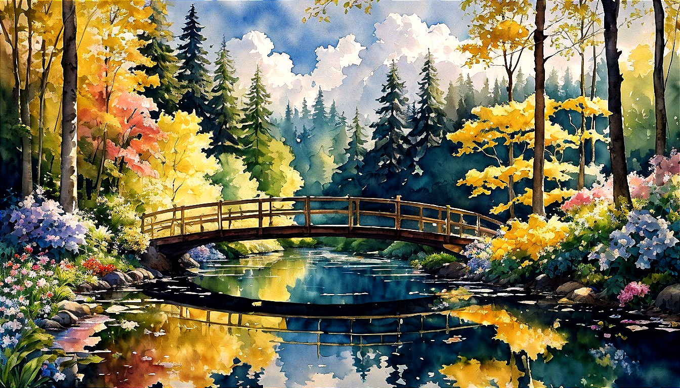 A serene watercolor scene depicting a wooden bridge over a tranquil pond, surrounded by vibrant autumn foliage and tall evergreens, reflecting a clear blue sky with fluffy clouds.