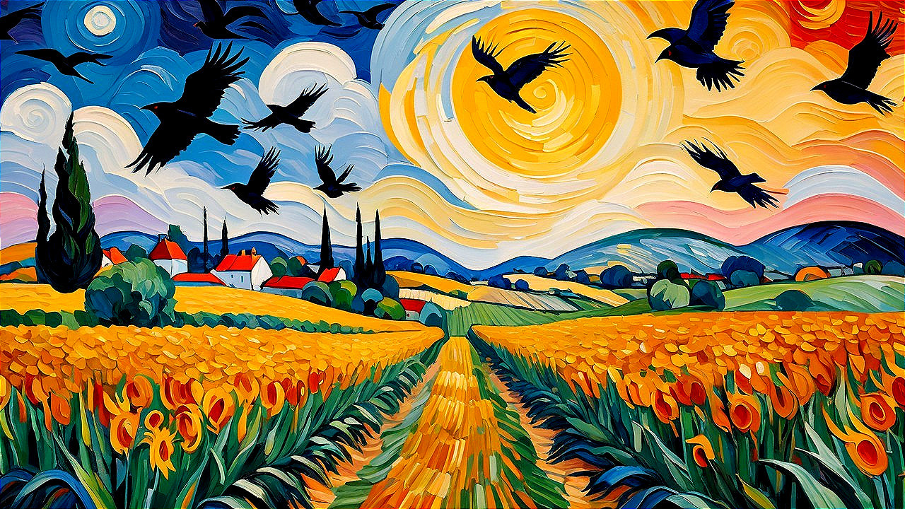Neo-impressionist painting inspired by Van Gogh, featuring a vibrant and expressive style. The foreground is dominated by a field of golden-yellow tulips and other unidentifiable flowers with green leaves. A path carved through the flowers extends into the distance. In the middle ground, there are small white and