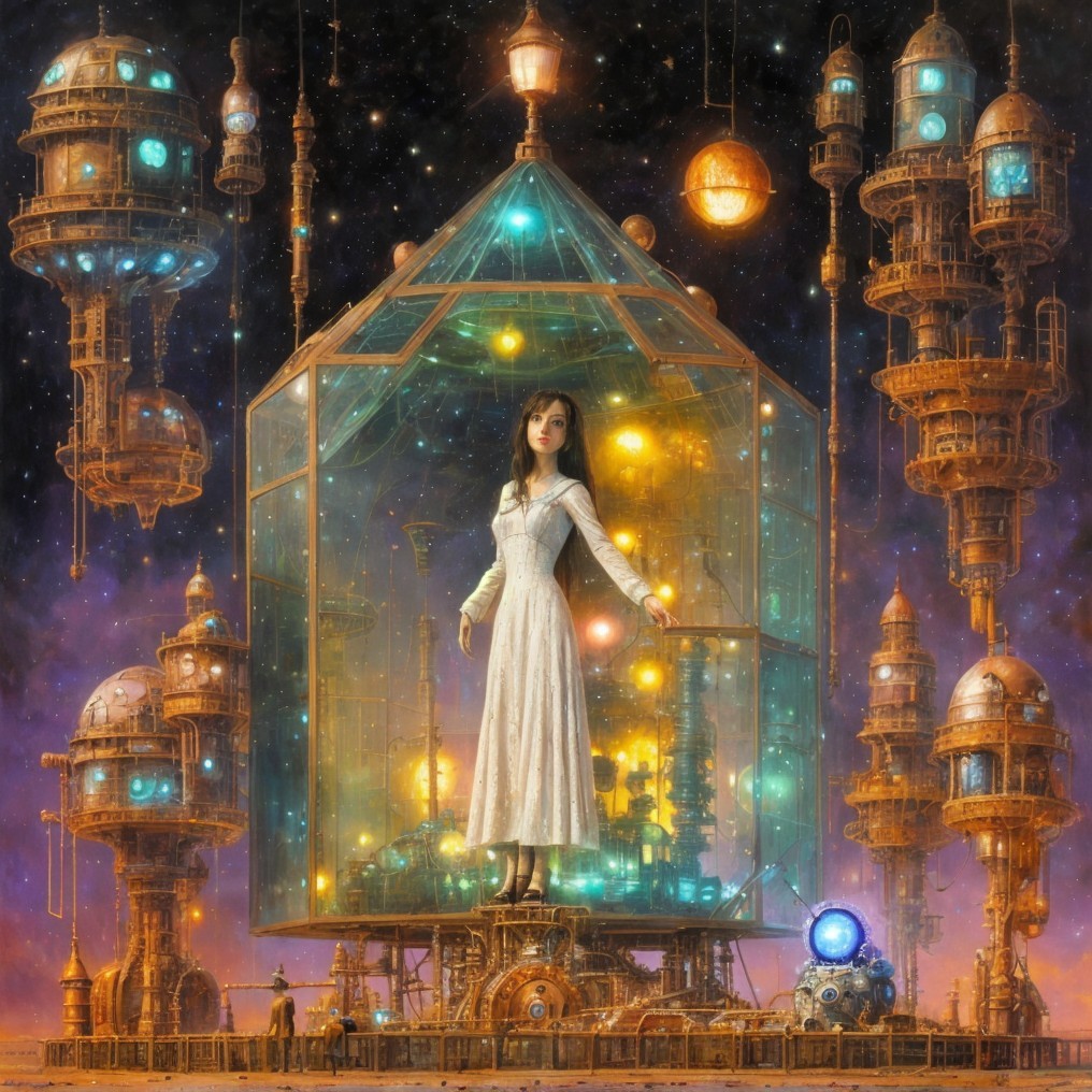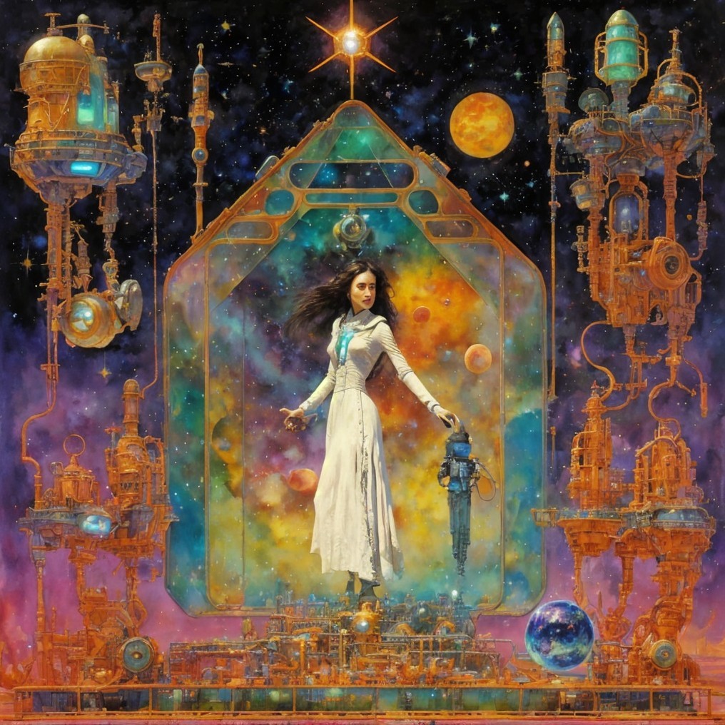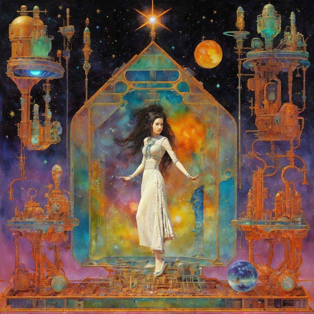 + Prompt:A mysterious woman emerges from a time travel portal. Painting by Robert Roger Ingpen. Surreal scene. MACHINARIUM style. An portrait of a Cosmopunk devices from all over the Galaxy. Denis Sarazhin, Zinaida Yevgenyevna Serebriakova, highly detailed dynamic lighting crisp quality focused Dramatic light and shadows Slanted side light Blended gouache, watercolor, pencil line art Simple, well balanced composition Ida Ten Eyck O'Keeffe, Dummy. Music album cover. Handwritten letters. Inscription HUKHUK. Colorful Painting by Remedios Varo.