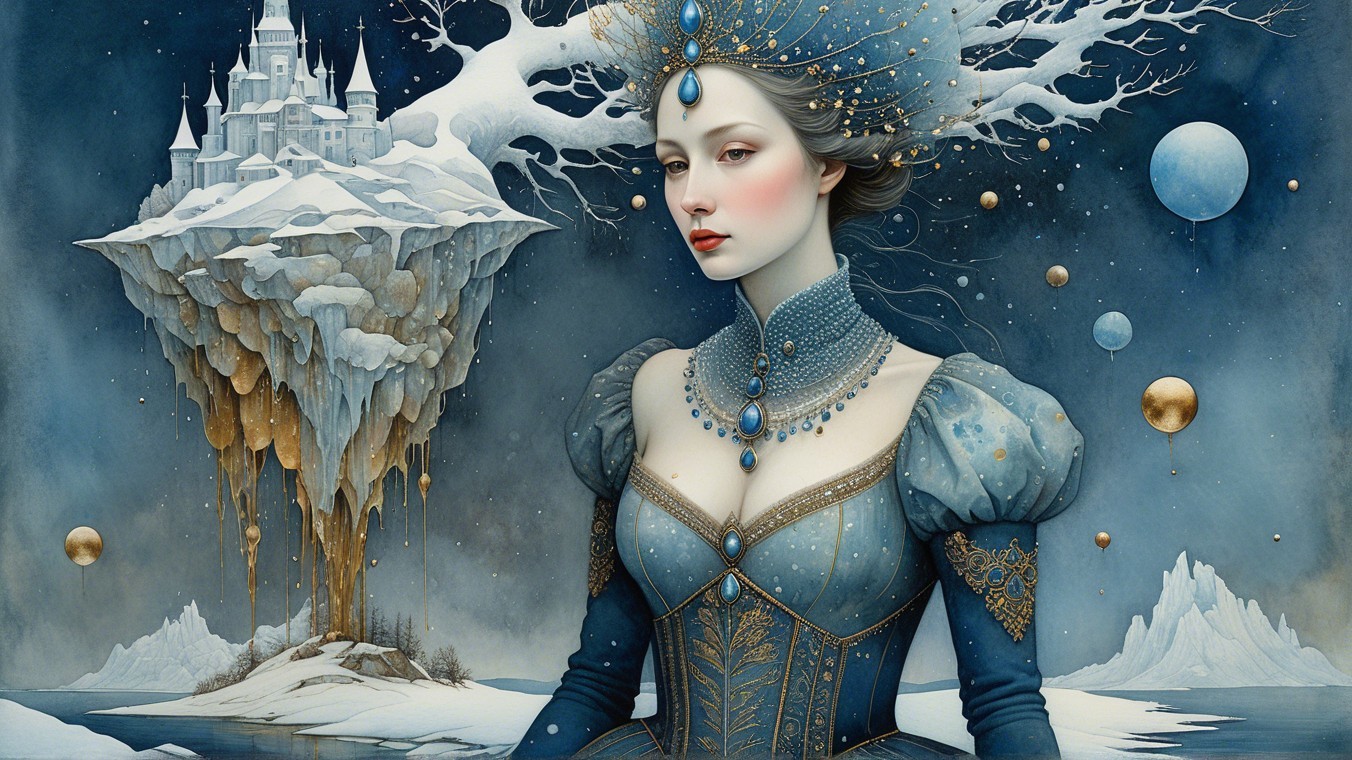 Prompt: "Catrin Welz-Stein, Zdzisław Beksiński, Jacek Yerka and Yossi Kotler style mix, surreal winter landscape, watercolour and ink illustration, wet-on-wet, loose water effects, white, salmon, indigo and golden paint splatter, voronoi pattern, richly textured, ice queen with frozen Queen Anne's lace and grasses, river, clouds, by Susanne, beautiful vibrant colors, opalescent gradient.