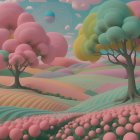 A vibrant landscape features rolling hills adorned with pastel-colored trees in shades of pink, turquoise, and orange, complemented by a field of colorful blooming flowers.