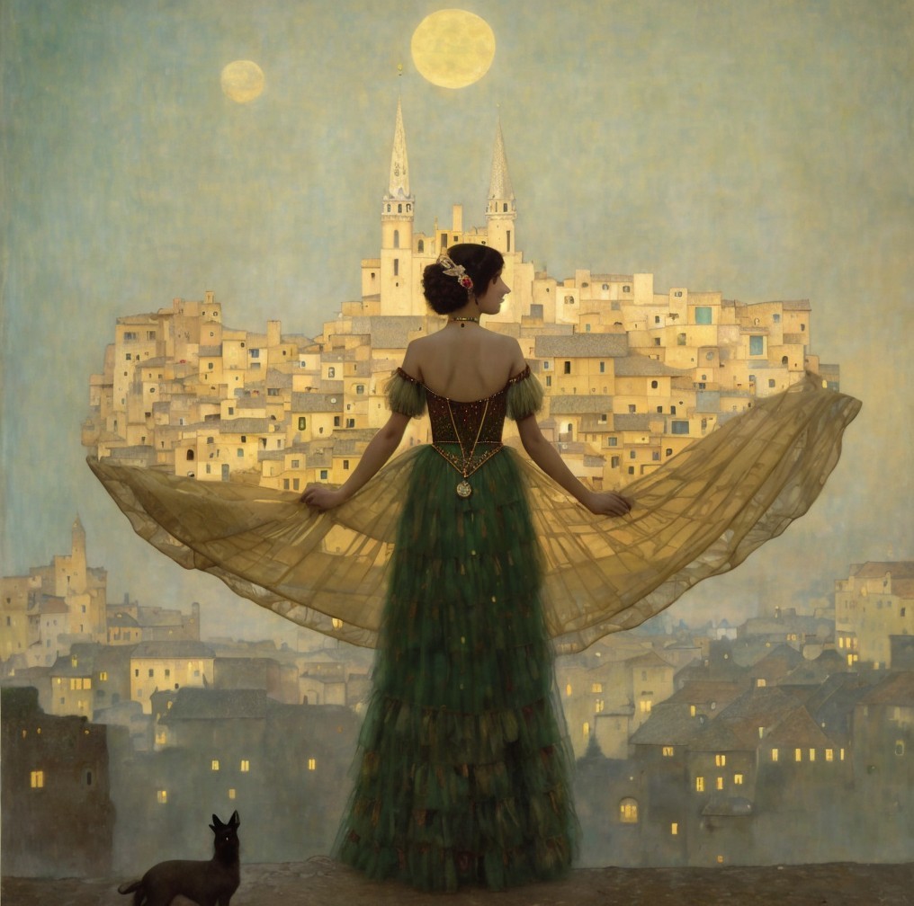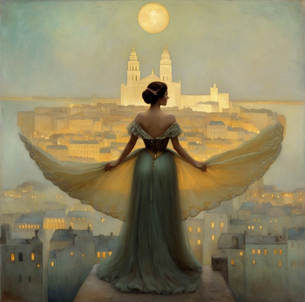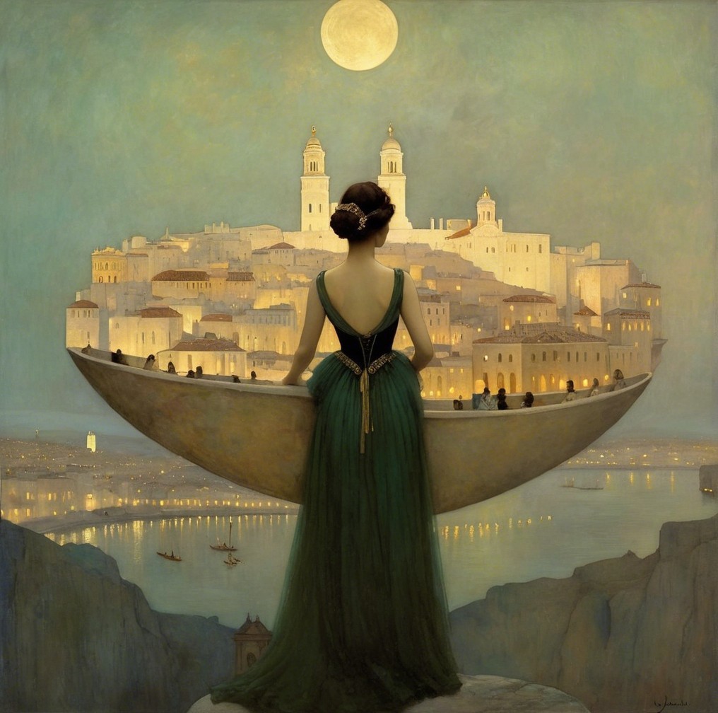 A woman in an elegant green gown stands by a serene waterfront, gazing at a moonlit city with grand buildings and boats, creating a tranquil and romantic atmosphere.