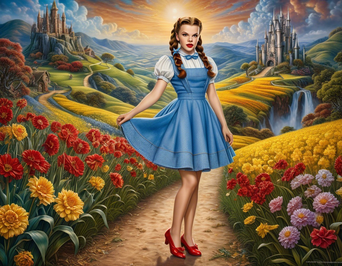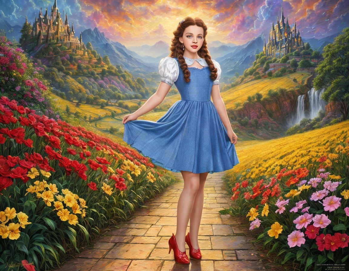Dorothy Gale in a blue dress and red shoes stands on a path among colorful flowers. Behind her are rolling hills and castles under a vibrant sunset, evoking a whimsical, fantasy landscape.