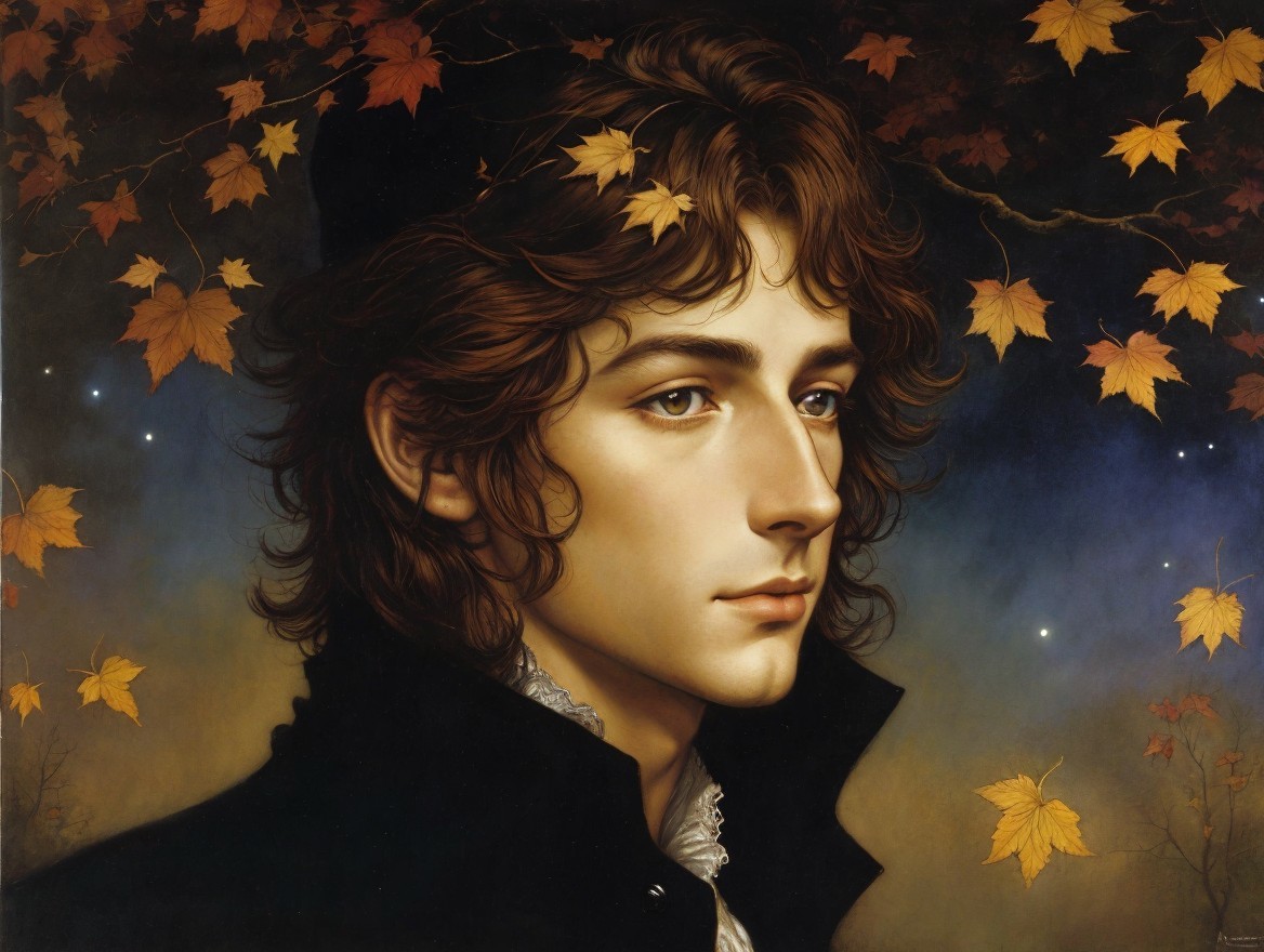 A young man with voluminous, curly hair gazes towards the distance. He stands amidst autumn leaves, with the Eiffel Tower subtly visible in the background, creating a romantic Parisian vibe.