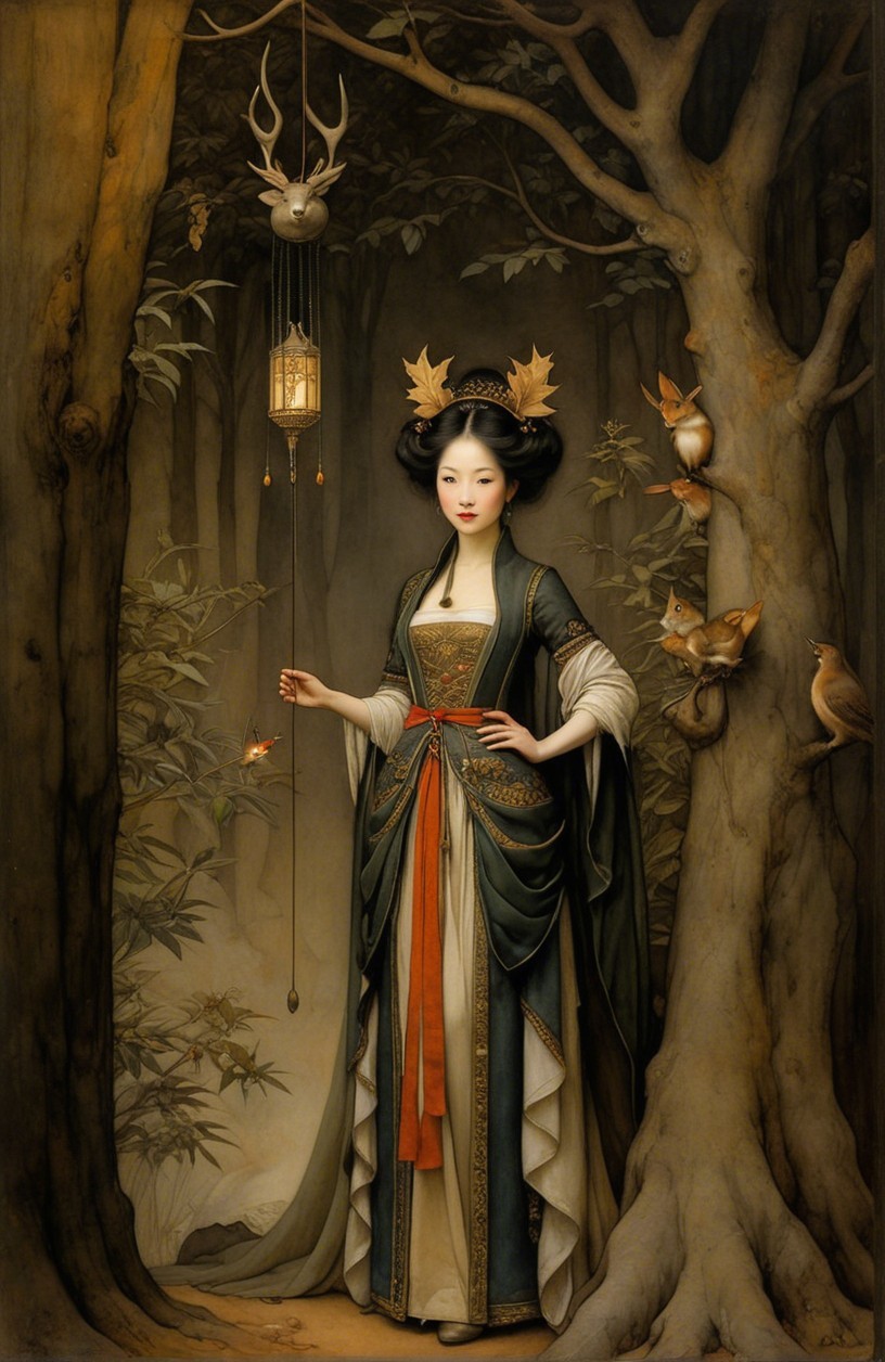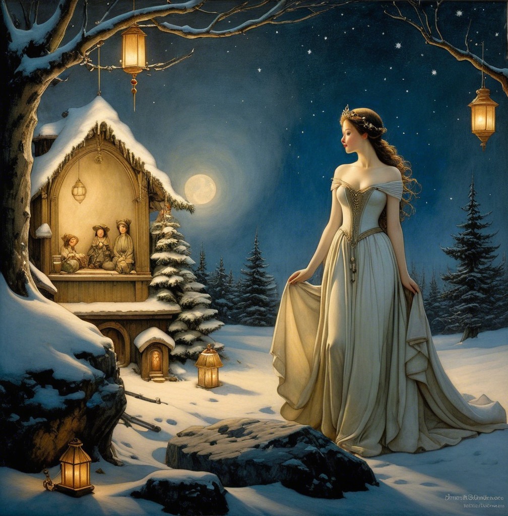 A mystical figure with long, flowing hair, adorned with antlers and wings, sits gracefully on a rocky ledge. She wears a shimmering blue dress, set against a soft, moonlit forest backdrop.