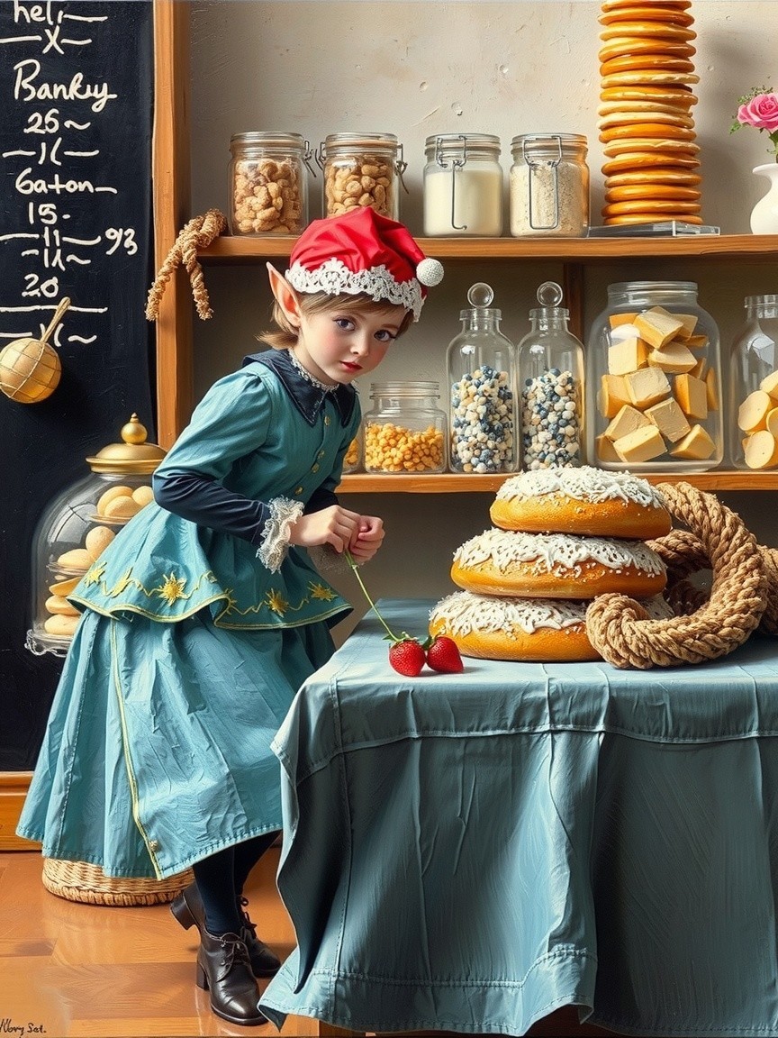 A young elf girl in a festive red hat and blue dress sneaks a peek at a table laden with large, frosted donuts and apples, set against a charming, cozy bakery backdrop.