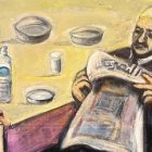 A man in a tuxedo and bowler hat sits at a table, reading a newspaper. The table is set with food, drinks, and a colorful background, creating a vibrant, lively atmosphere.