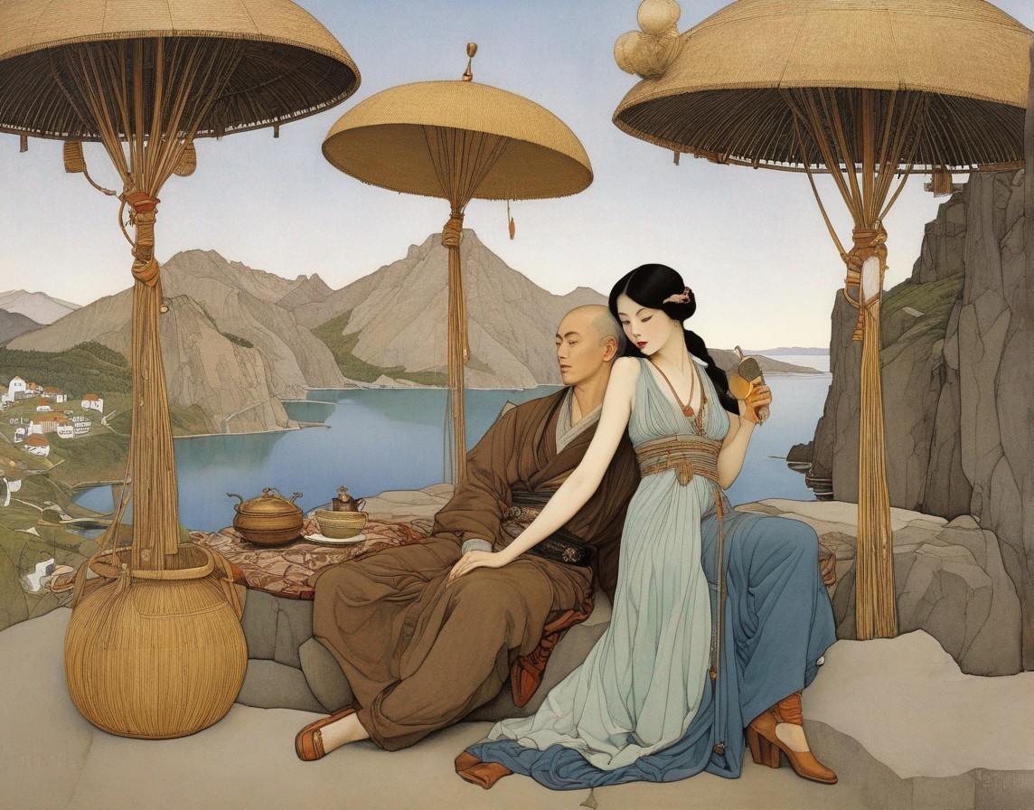 A woman in a gold dress and wide-brimmed hat sits pensively on a balcony overlooking a coastal town and sea.