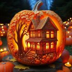 A whimsical Halloween scene featuring a glowing pumpkin-shaped house surrounded by vibrant pumpkins, a twisted tree, and whimsical birds, all set against a dark, mystical background.
