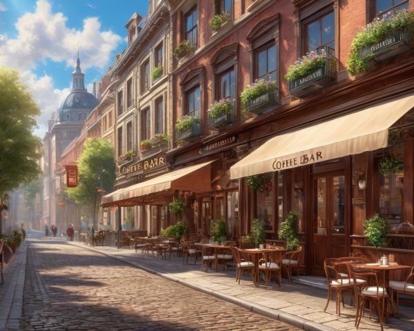 A scenic aerial view of a charming town with red-roofed buildings, lush green trees, and towering spires. The sky is bright with fluffy clouds, creating a serene, picturesque atmosphere.