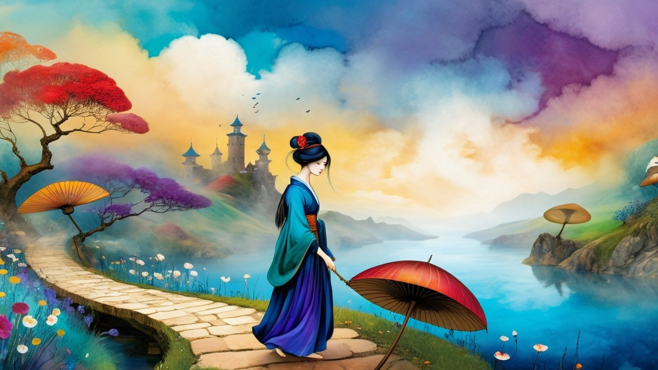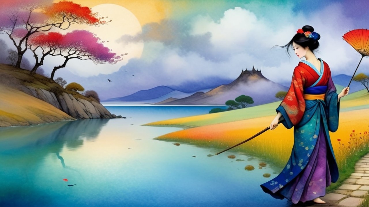 A serene scene depicts a woman in traditional attire by a tranquil river, with Mount Fuji in the background. The sky glows with warm hues, and cherry blossom trees frame the picturesque landscape.