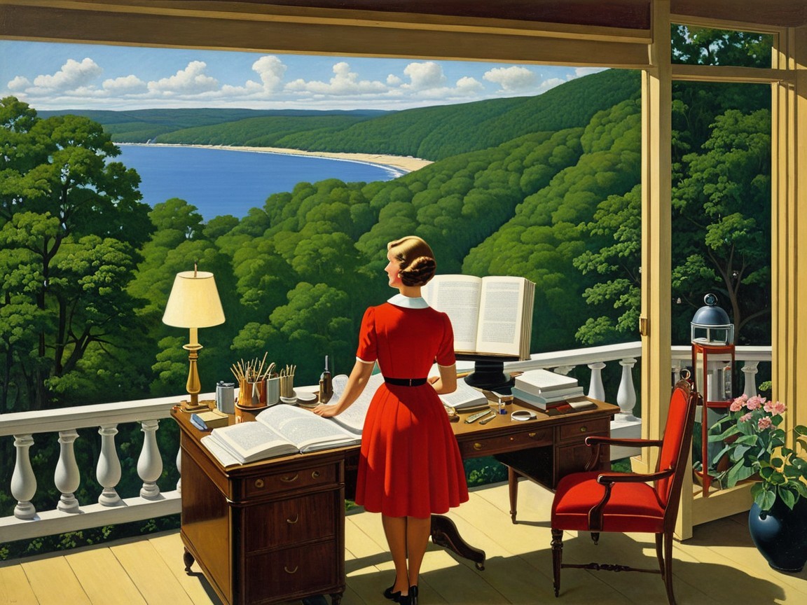 A woman in a red dress stands at a desk with a view of a serene lake and lush greenery outside. Sailboats glide across the water, while a charming house peeks through the trees.