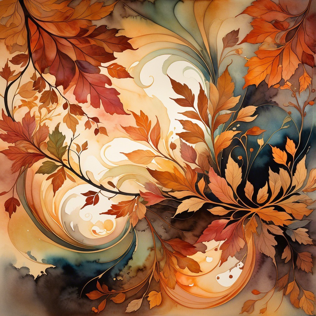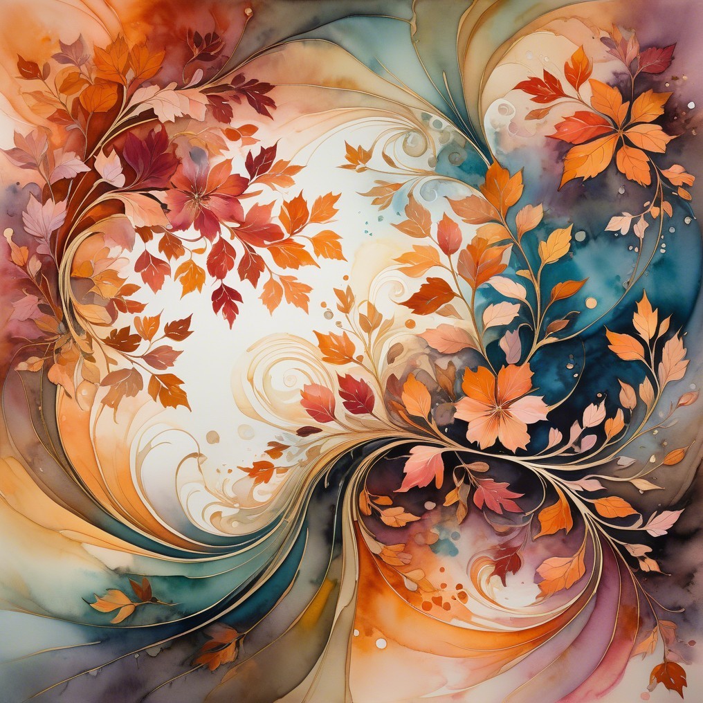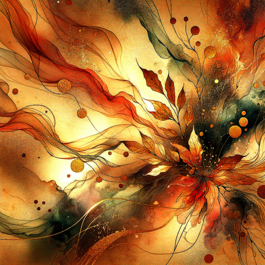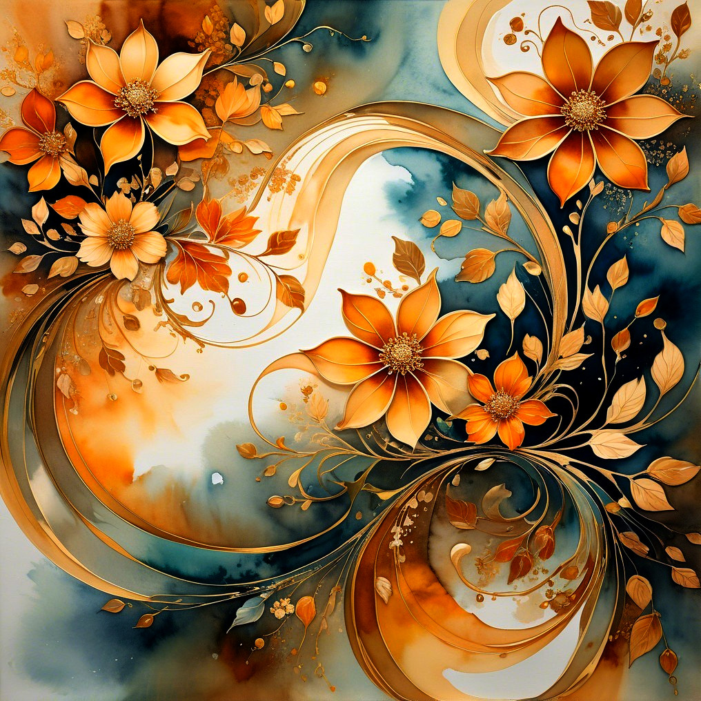 A serene woman in a flowing golden robe is surrounded by vibrant flowers and swirling patterns. The warm colors create a harmonious, dreamlike atmosphere, evoking beauty and tranquility.