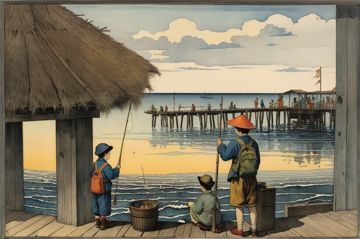 A joyful figure in casual attire dances in a vibrant room, surrounded by colorful balls and a suitcase, with a dreamy landscape and glowing orbs illuminating the serene setting.