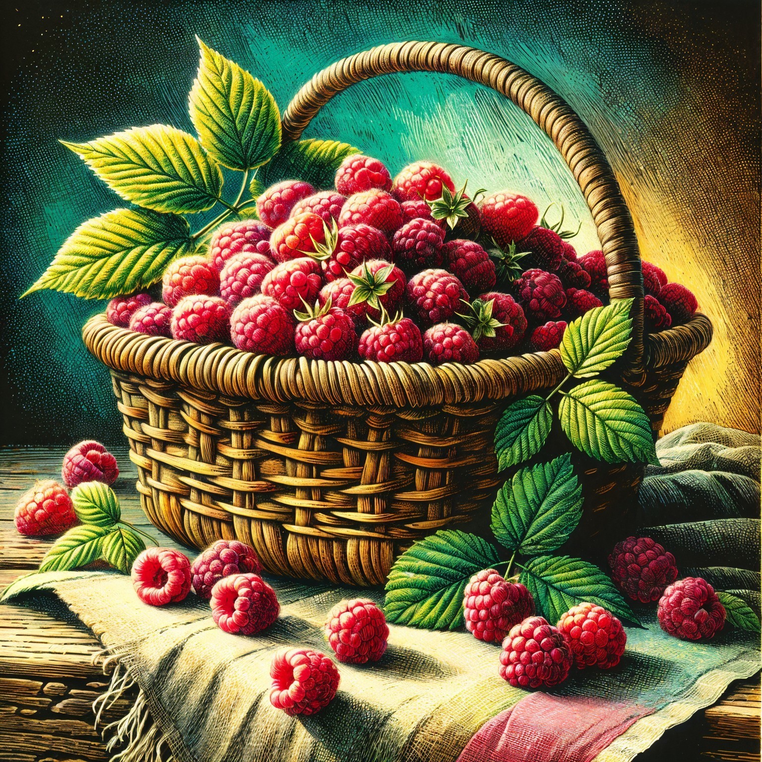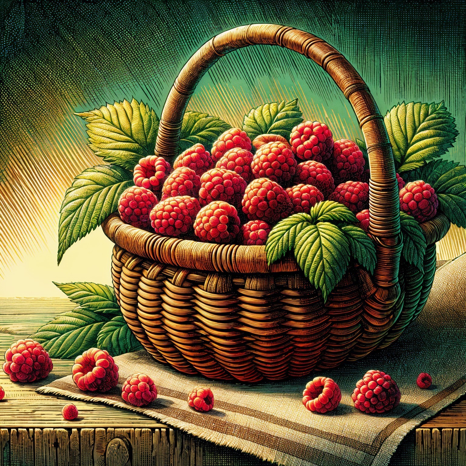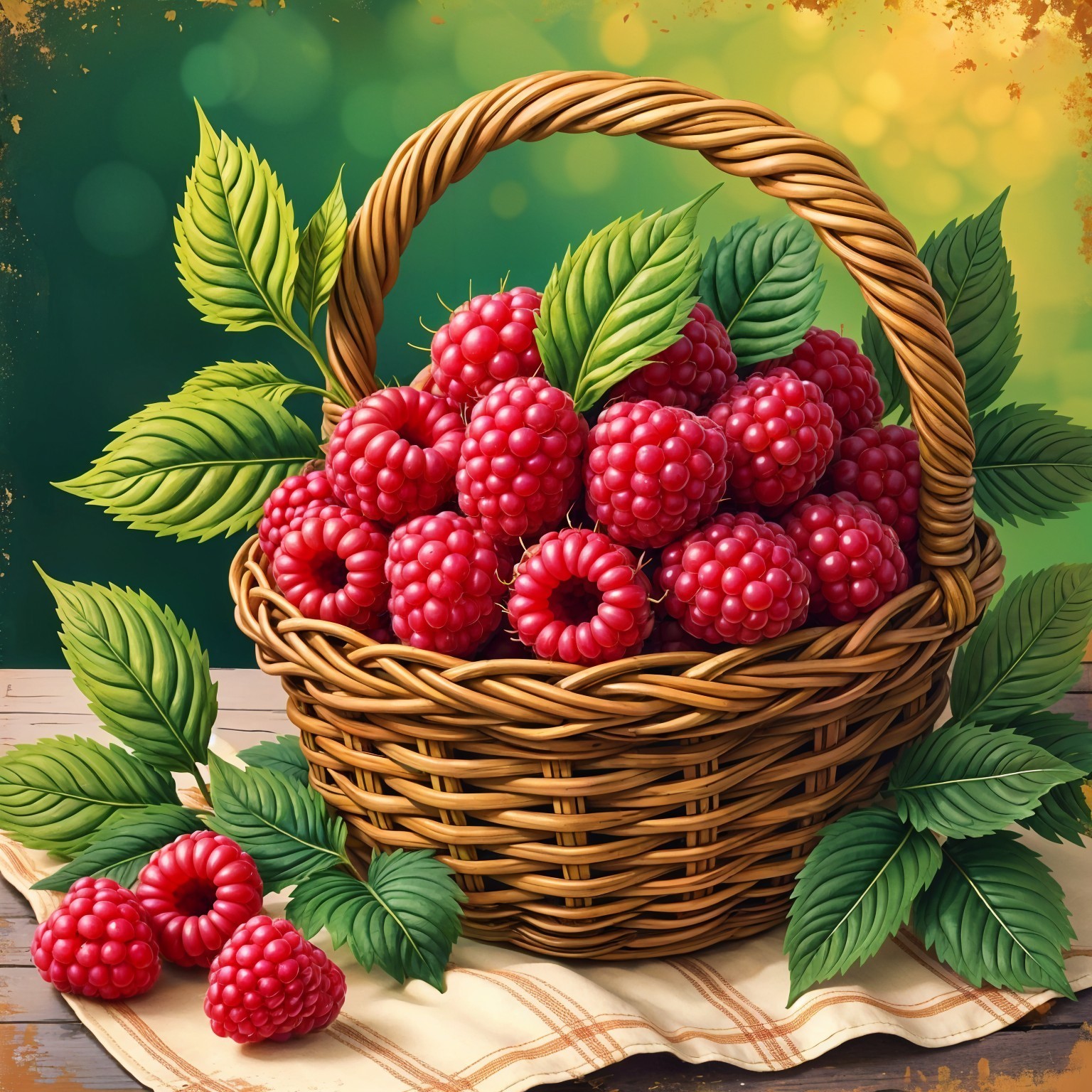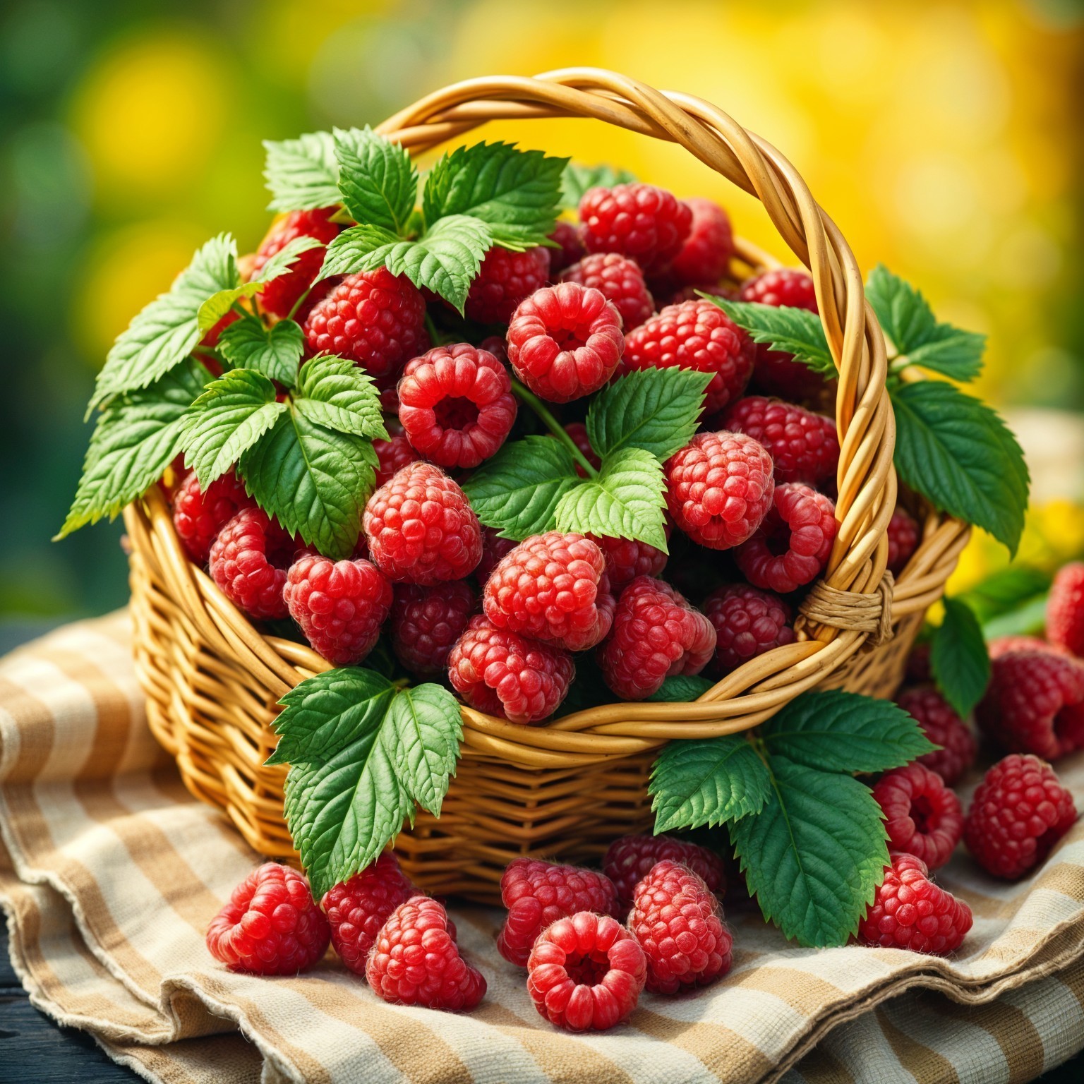 A woven basket brimming with plump, red raspberries, accented by vibrant green leaves, rests atop a checkered cloth in warm, natural light, evoking a fresh, summery feel.