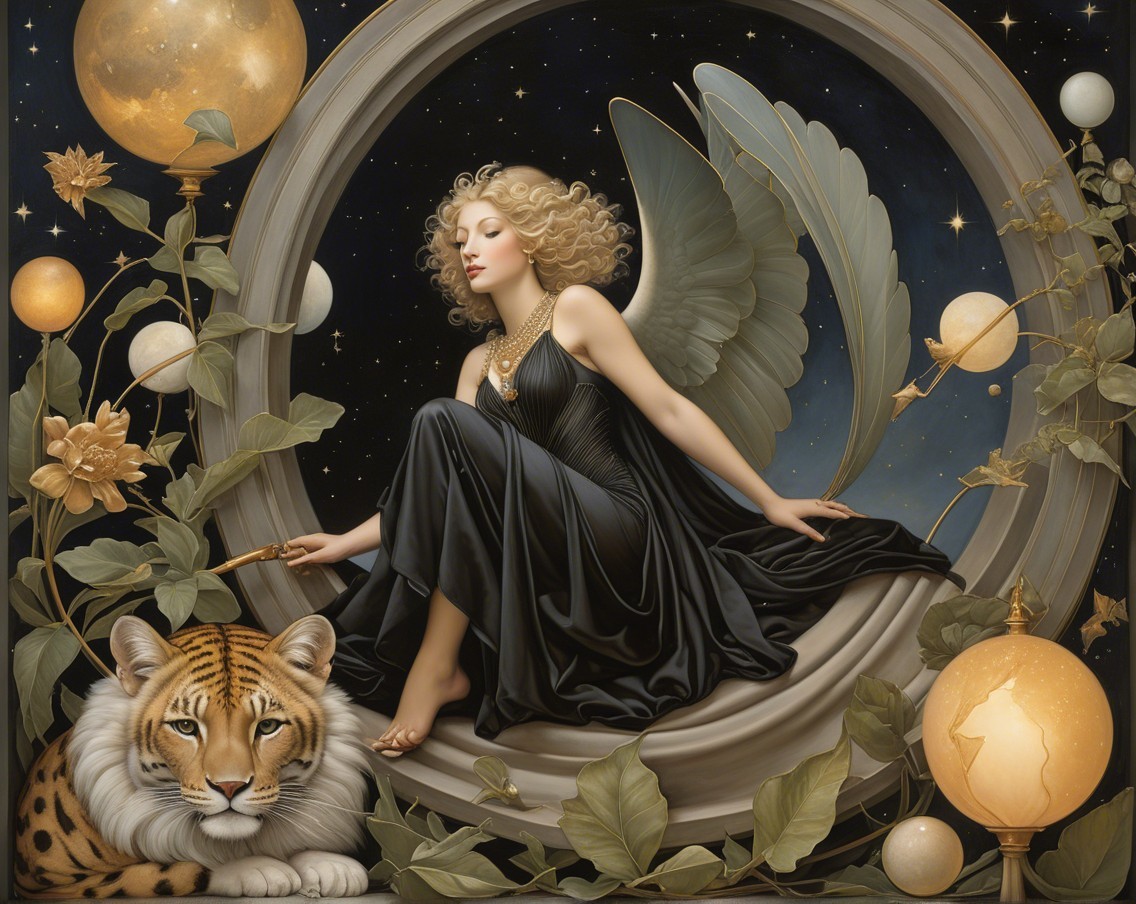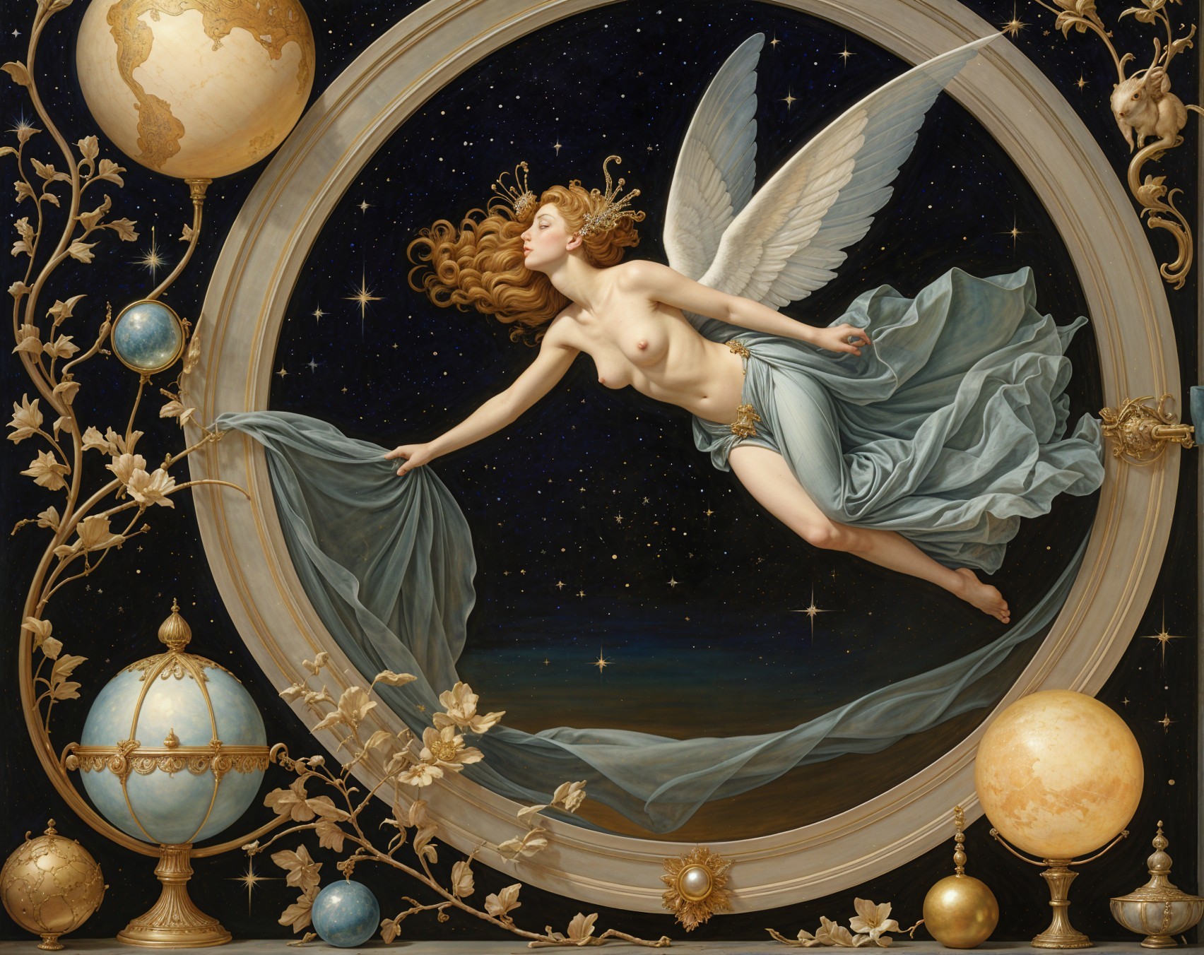 An ethereal scene featuring a winged figure guiding celestial elements, accompanied by two regal women and a fox, all set against a starry background with globes and ornate designs.