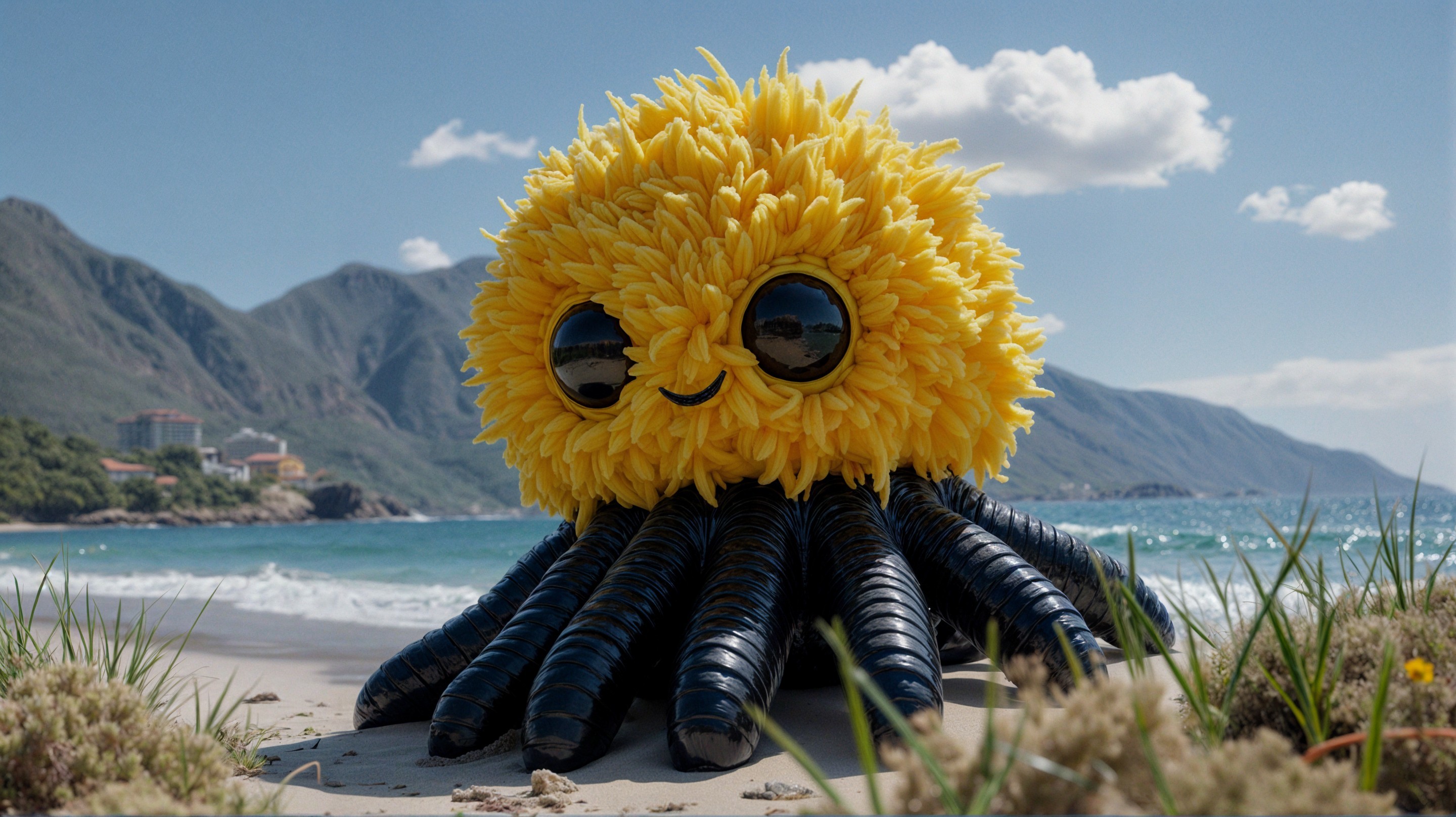 A vibrant, whimsical octopus made from bright yellow feathers and black tendrils rests on a sandy beach, with a stunning coastal backdrop of rolling hills and turquoise waters.