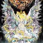 A vibrant digital painting depicts an angel with white feathered wings and golden light emanating from its body and hands, aiming a beam of light at an meteor falling to Earth. The angel is wearing a white garment and has distorted hands reaching out. Above the angel is a floating, fiery, distorted skull-like