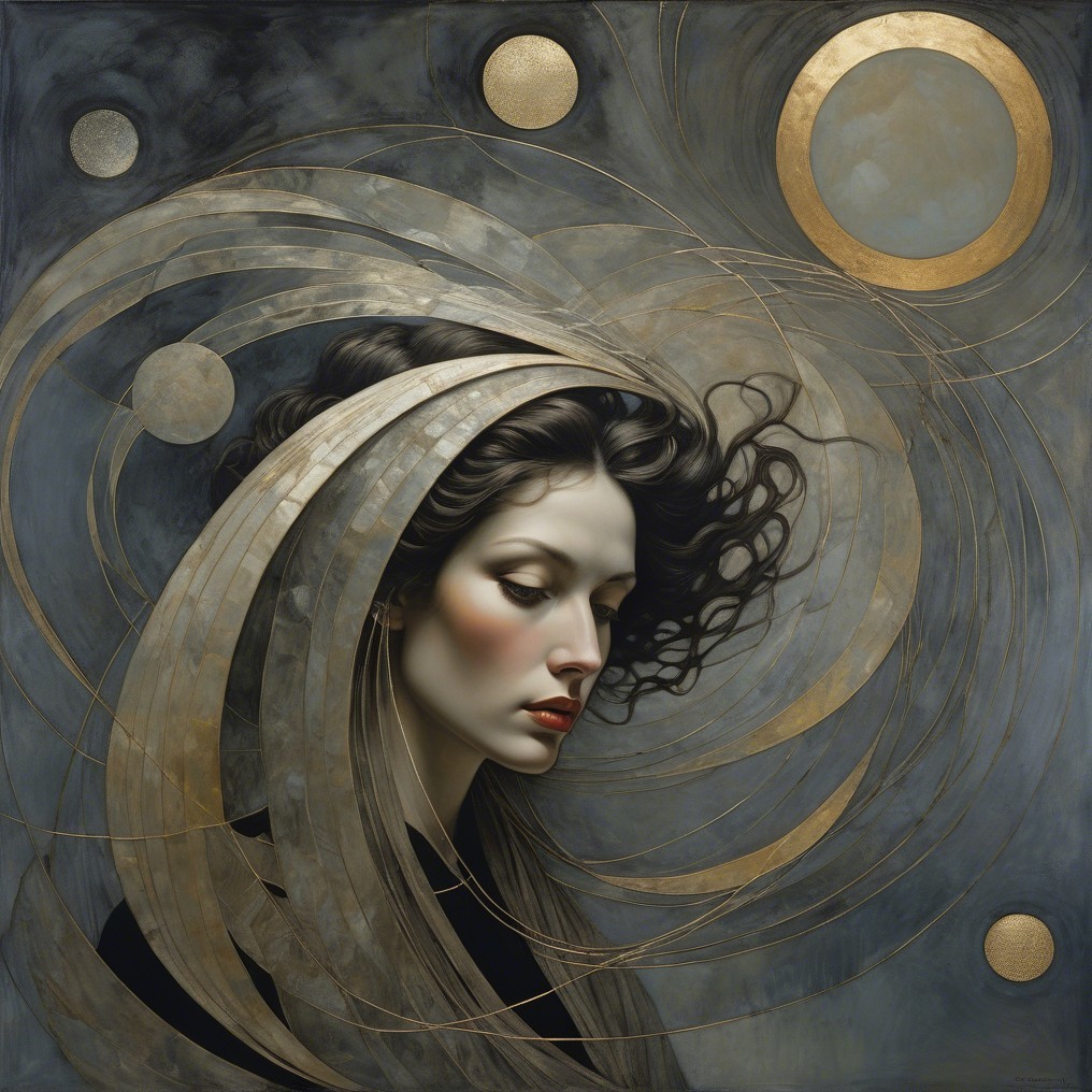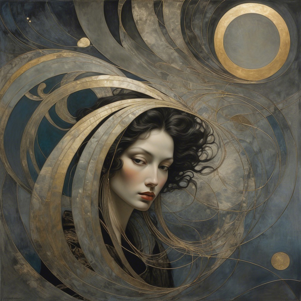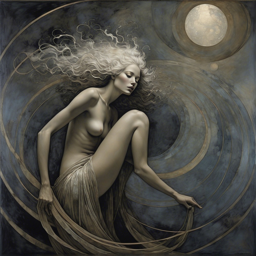Surreal dream Tribal soul. In the darkness I dance, nostalgia, glory, Mercury Glass patina, light and gossamer haze, topographic lines, Art Brut, moody, somber, desaturated colors. In the style of John Rogers cox . This artwork amalgamates the artistic styles of Michael Parkes,