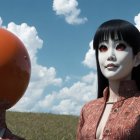 A woman with dark, wavy hair stands against a surreal landscape, facing a draped figure. The sky is filled with fluffy clouds, and the scene evokes a blend of realism and dreamlike fantasy.