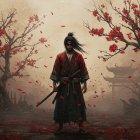 A lone samurai stands amidst swirling red petals, wearing a traditional robe. Cherry blossom trees frame the scene, evoking a sense of tranquility and strength in a misty, ethereal landscape.